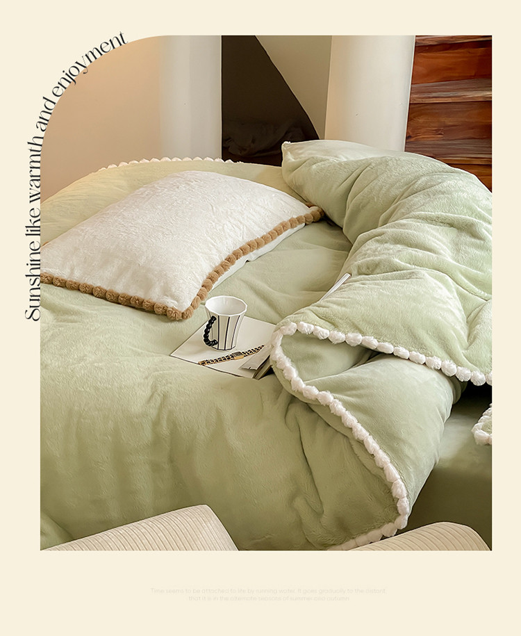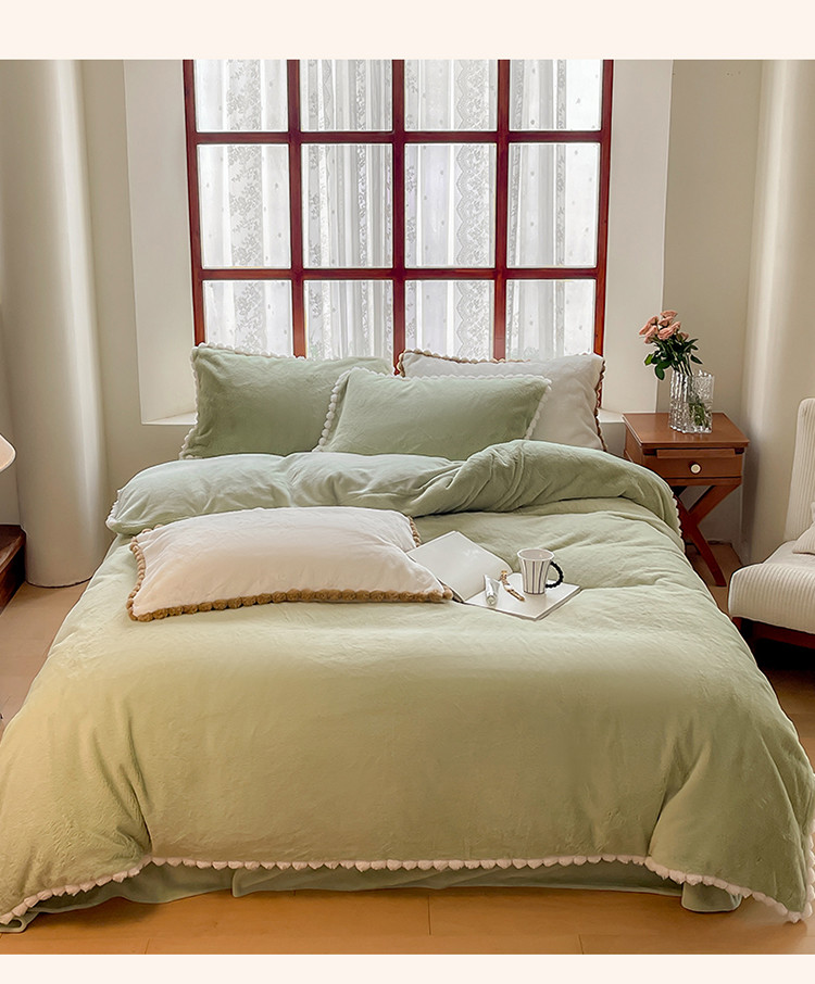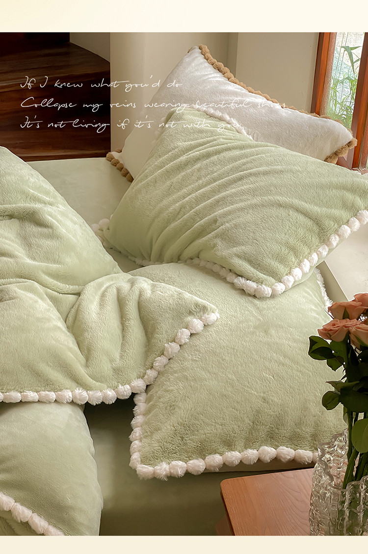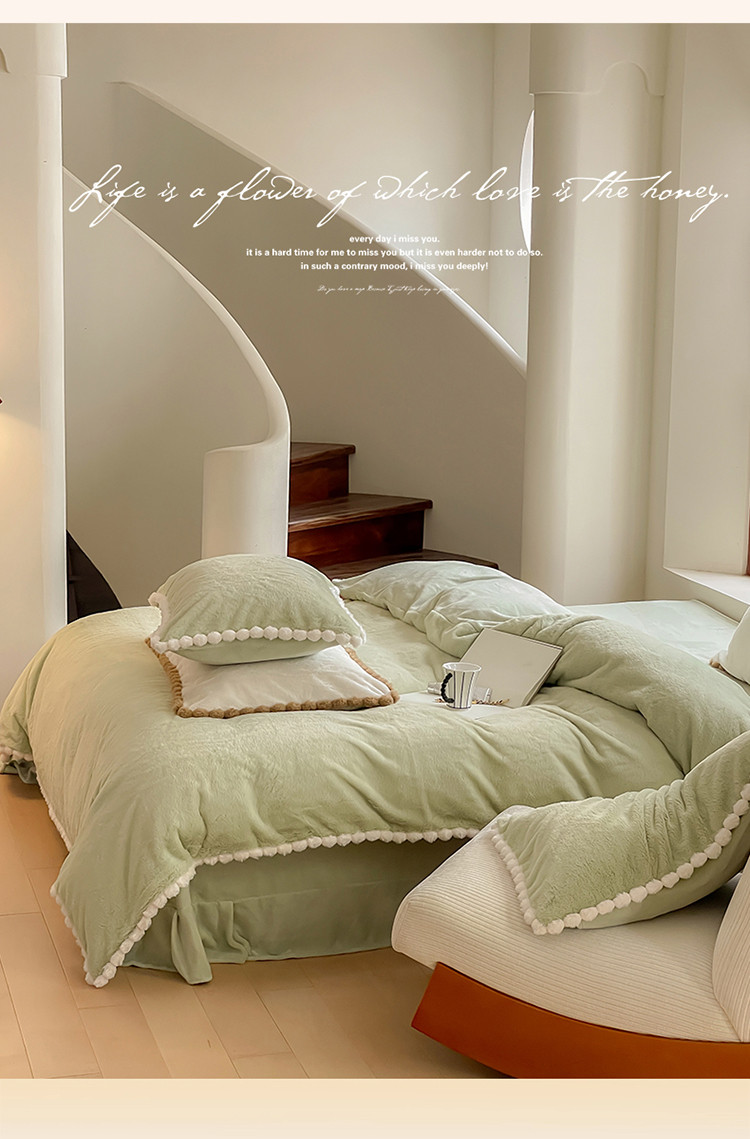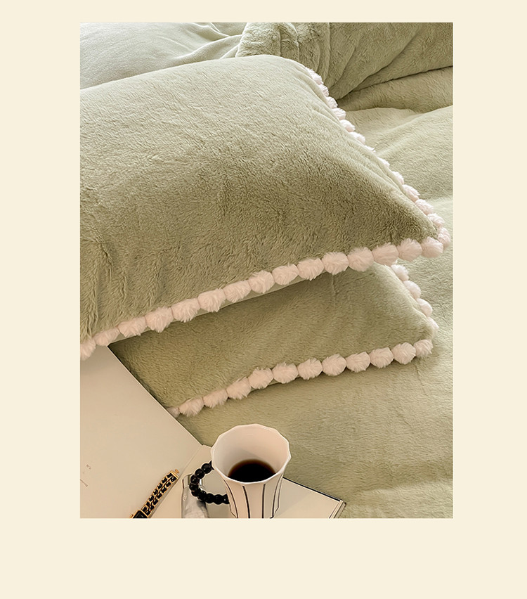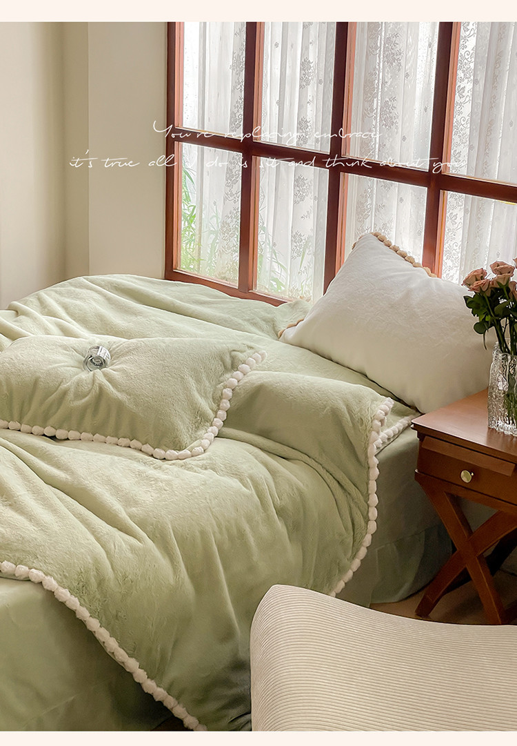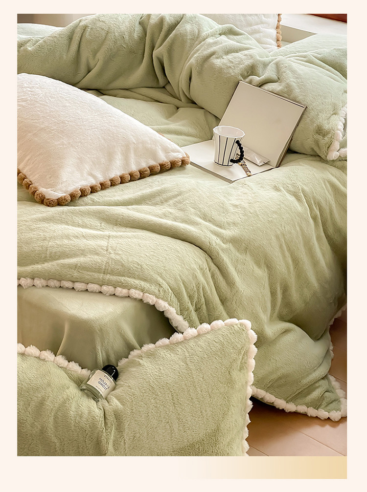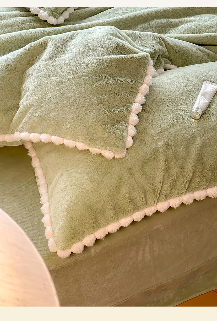 名品优仓 2023新款兔绒边带球球款纯色系列四件套-兔绒球球 兔绒球球-青稞绿