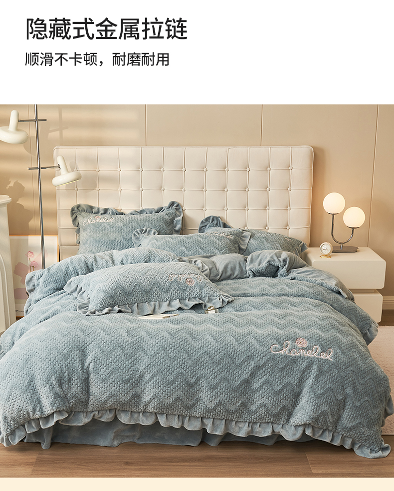 恒爱家纺 2023新款兔毛绒绣花四件套 波浪款-兰灰