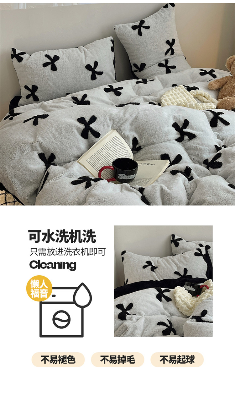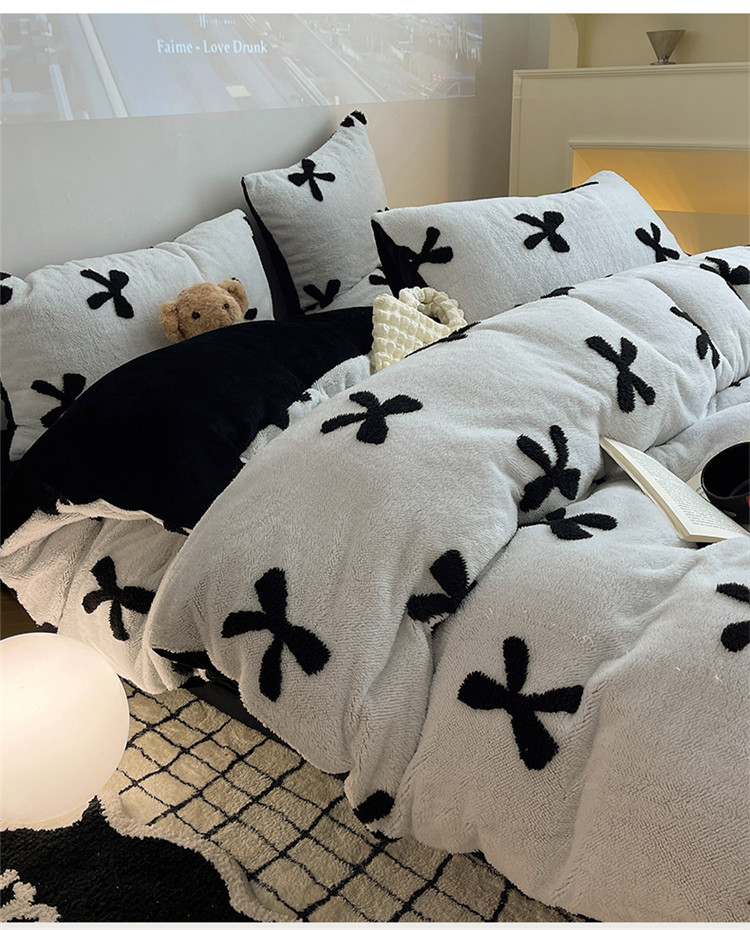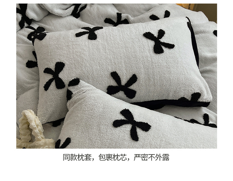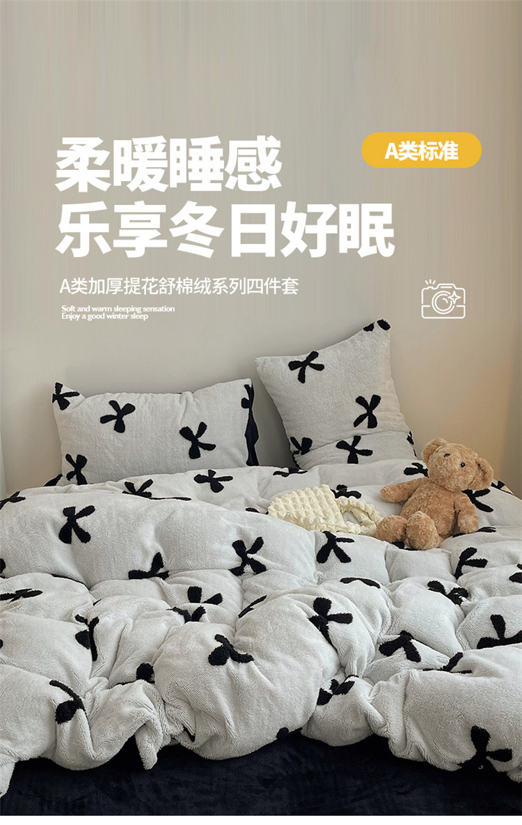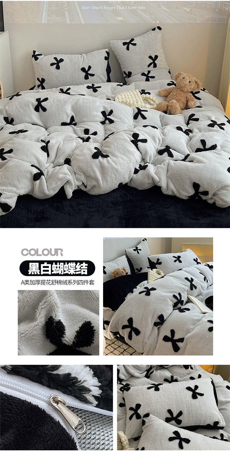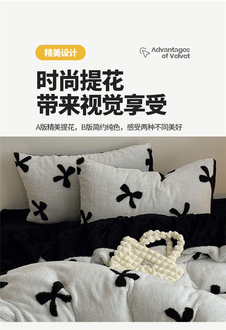 商品名称:桃子 2023新款A类加厚色纱舒舒绒提花蝴蝶结四件套 黑白蝴蝶结