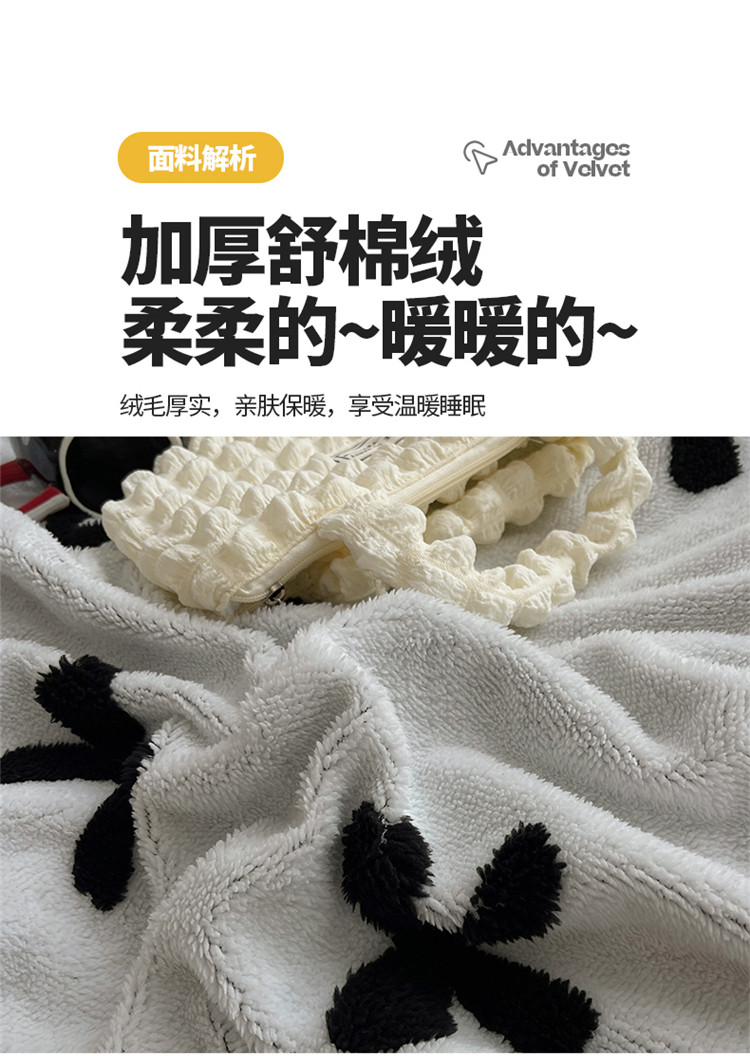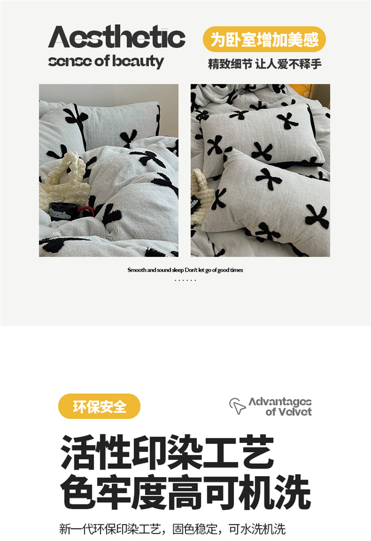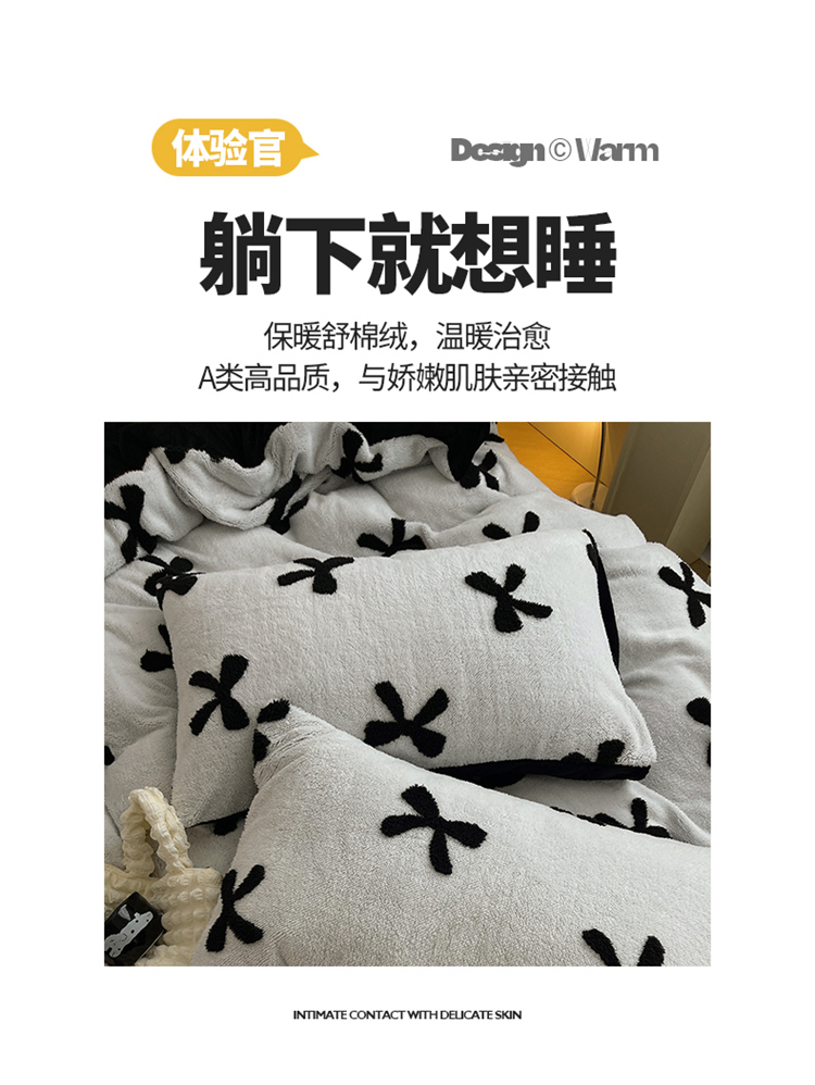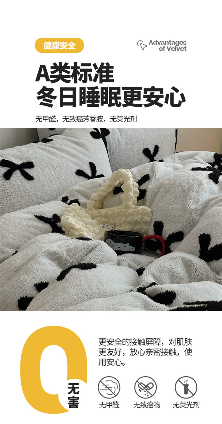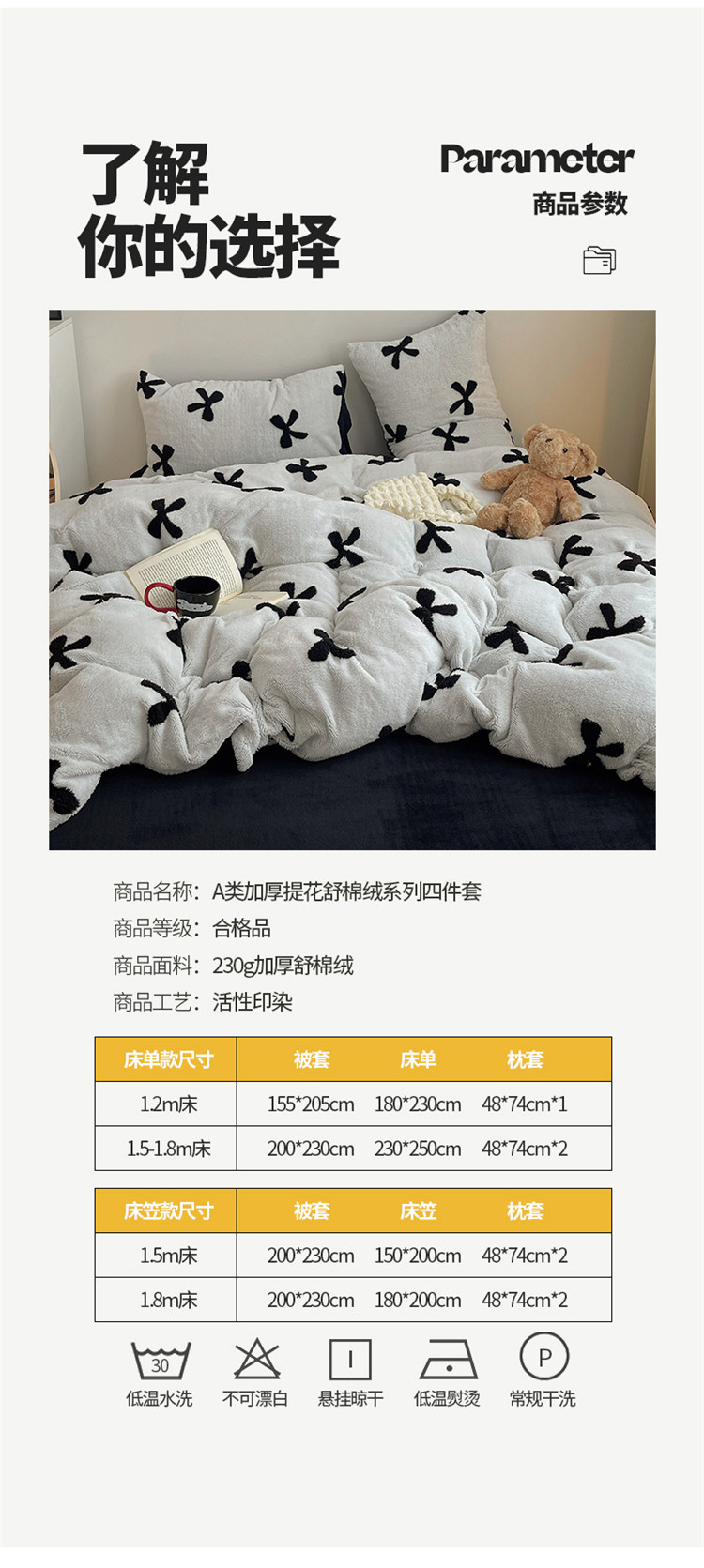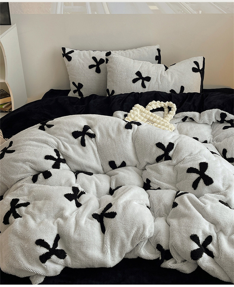 商品名称:桃子 2023新款A类加厚色纱舒舒绒提花蝴蝶结四件套 黑白蝴蝶结