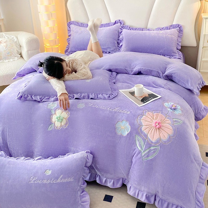 漫布云2025秋冬新款11斤230g全消光牛奶绒夹棉床盖款四件套纯色蕾丝花边刺绣床裙款床盖,蝶恋花-梦幻紫, 蝶恋花-嫩黄, 蝶恋花-新芽绿 ,蝶恋花-婴儿蓝 ,蝶恋花-樱花粉