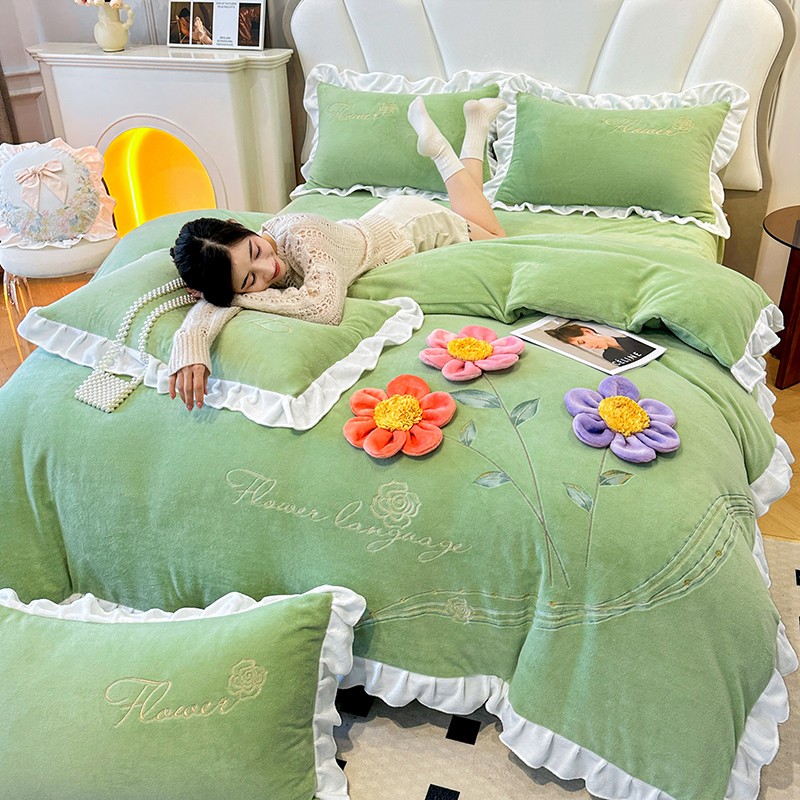 漫布云2025秋冬新款11斤230g全消光牛奶绒夹棉床盖款四件套纯色蕾丝花边刺绣床裙款床盖,蝶恋花-梦幻紫, 蝶恋花-嫩黄 ,蝶恋花-新芽绿, 蝶恋花-婴儿蓝, 蝶恋花-樱花粉