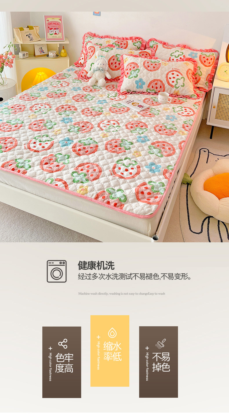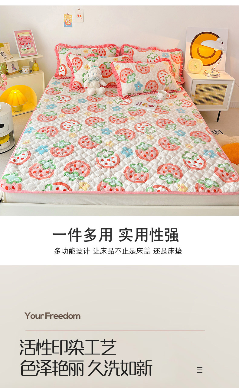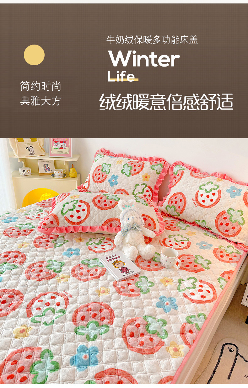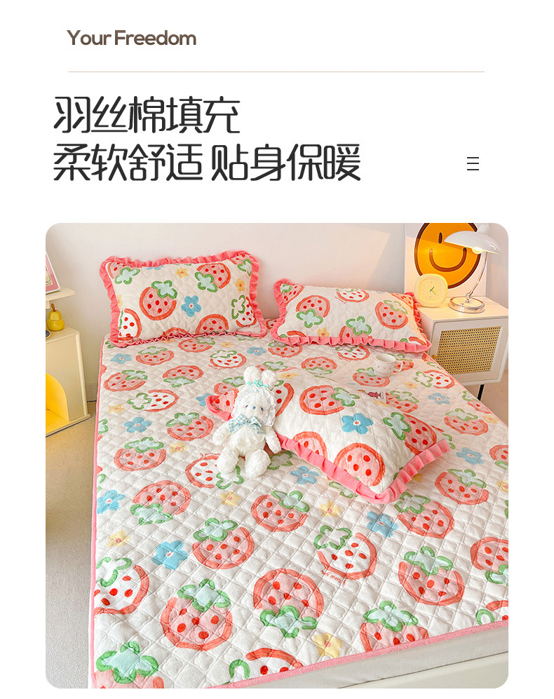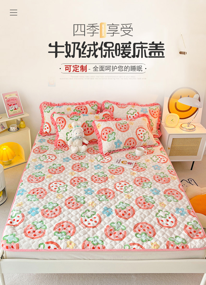 羽爱家纺 2024新款牛奶绒直边款床盖床垫 草莓园