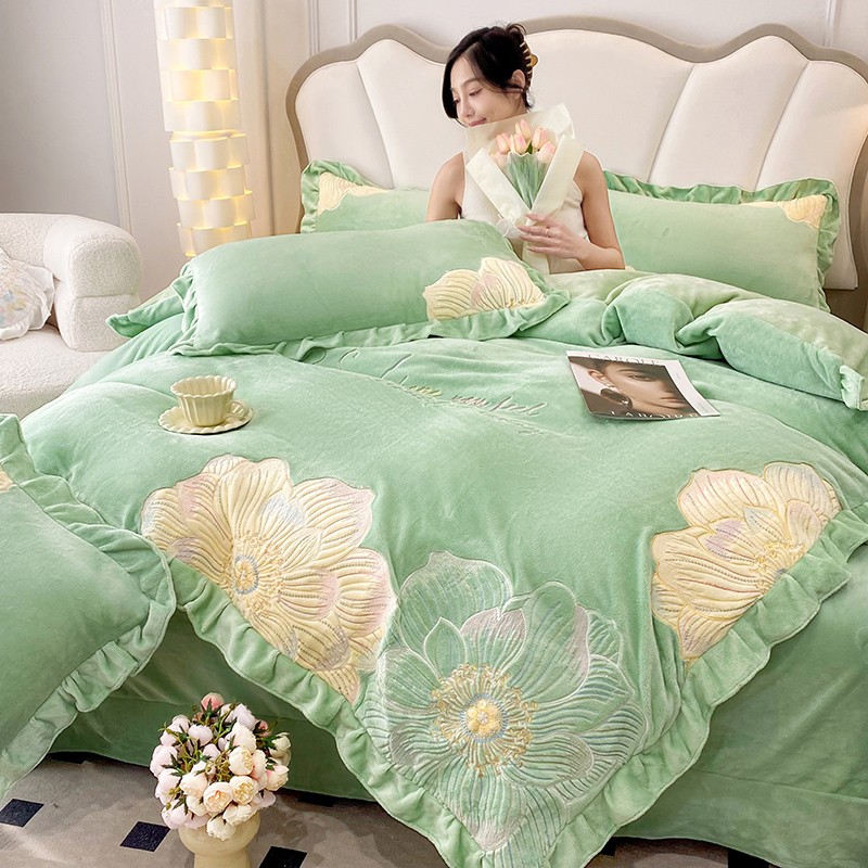 漫布云2025秋冬新款11斤230g全消光牛奶绒夹棉床盖款四件套纯色蕾丝花边刺绣床裙款床盖,蝶恋花-梦幻紫, 蝶恋花-嫩黄, 蝶恋花-新芽绿 ,蝶恋花-婴儿蓝 ,蝶恋花-樱花粉