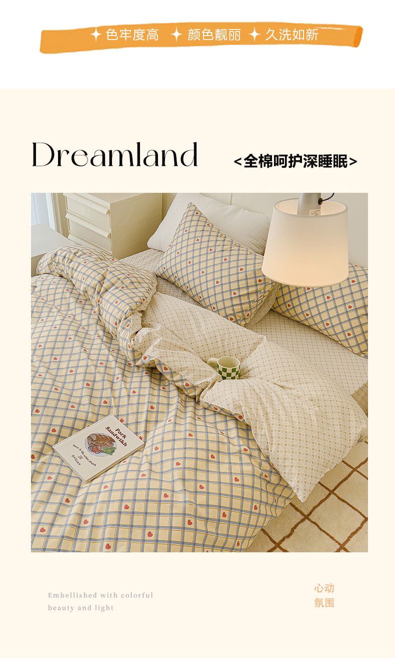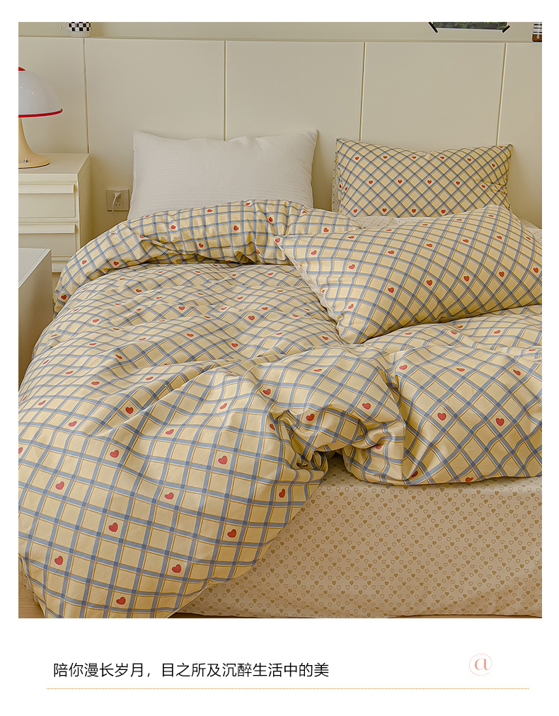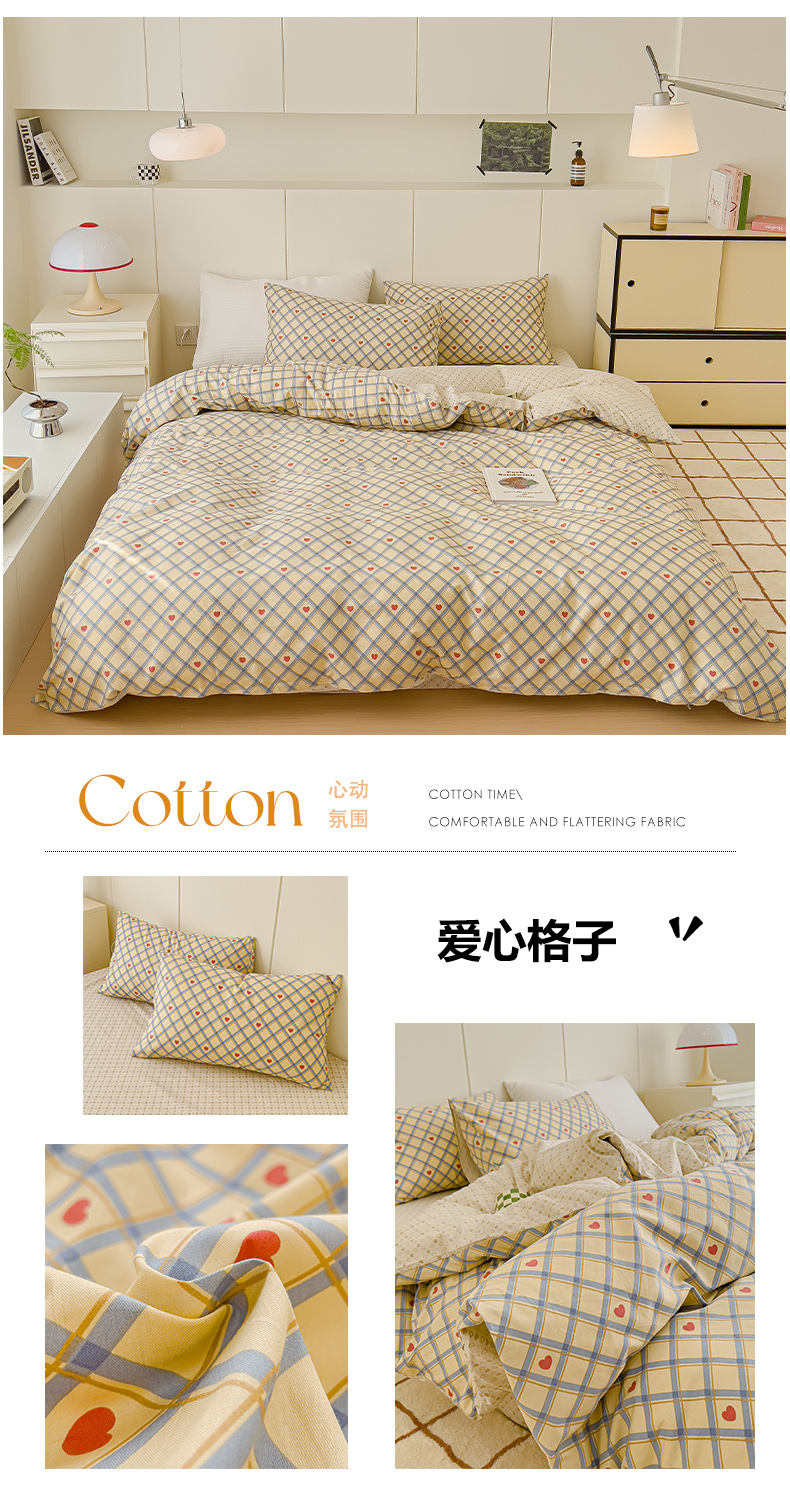 当前位置: 91家纺网 > 商品网购 > 床品套件 > 四件套 > 全棉普通四件套 > 感遇家纺 2024春夏新品全棉卡通印花四件套-第二批 爱心格子