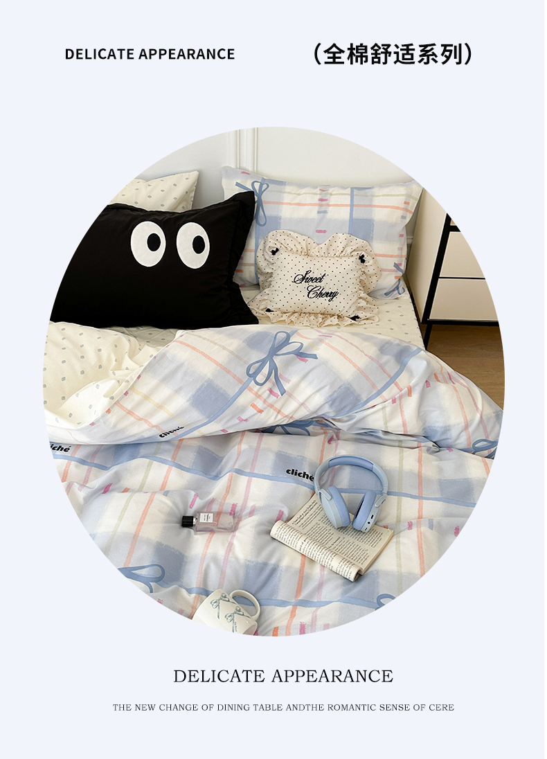 昔可 2024新款全棉格子元素四件套 蓝色丝带蝴蝶结