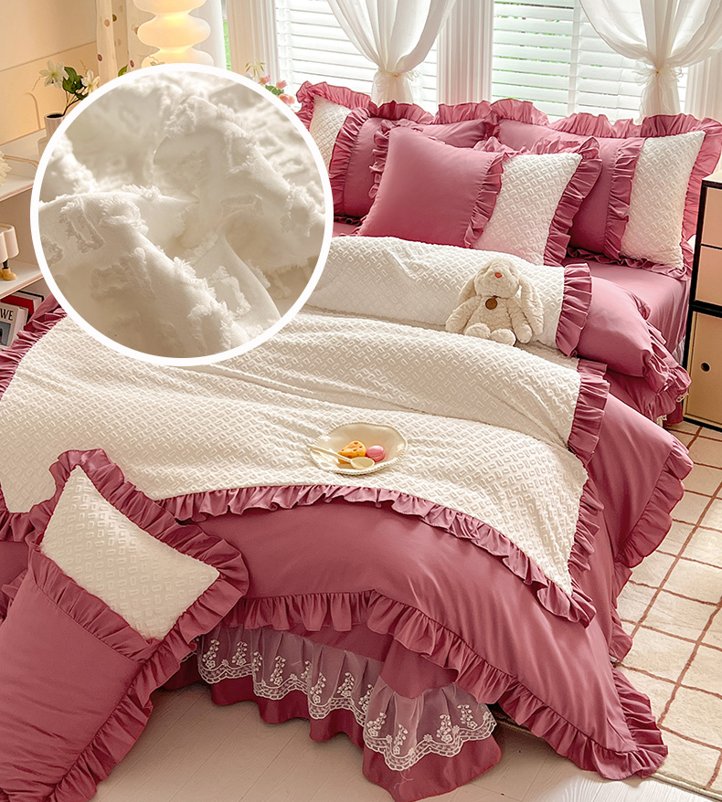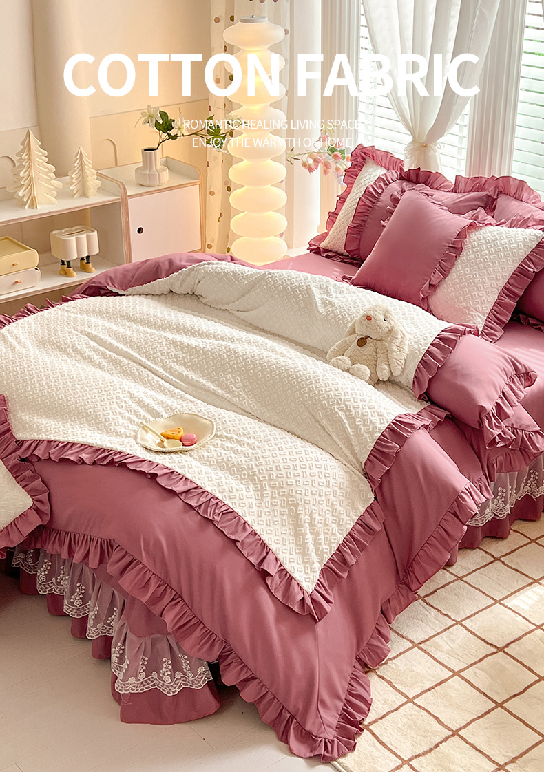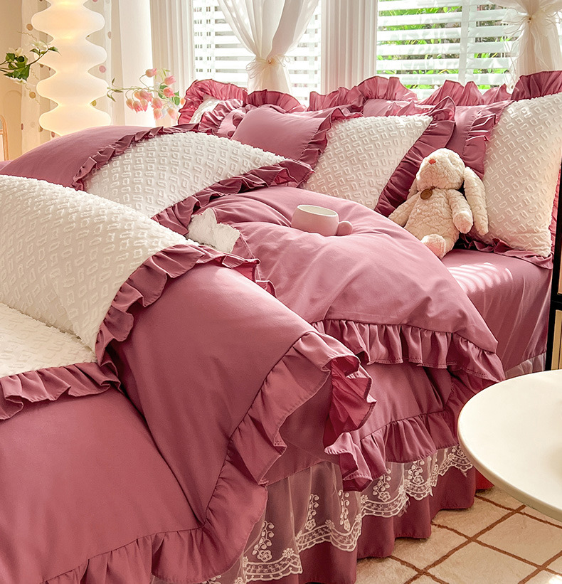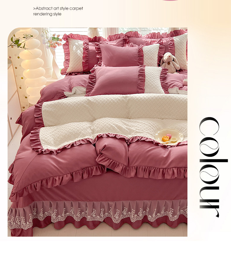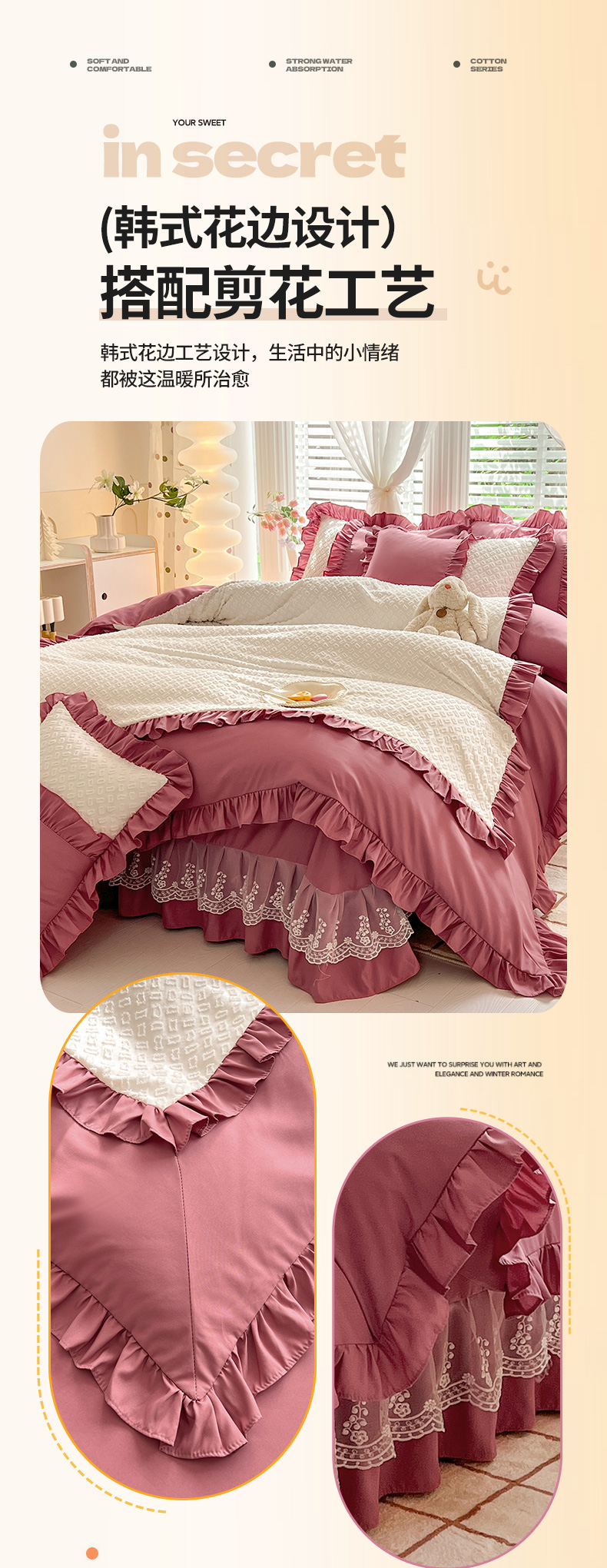 芭比蔓家纺 2024新款亲肤磨毛花边四件套---至爱 豆沙红