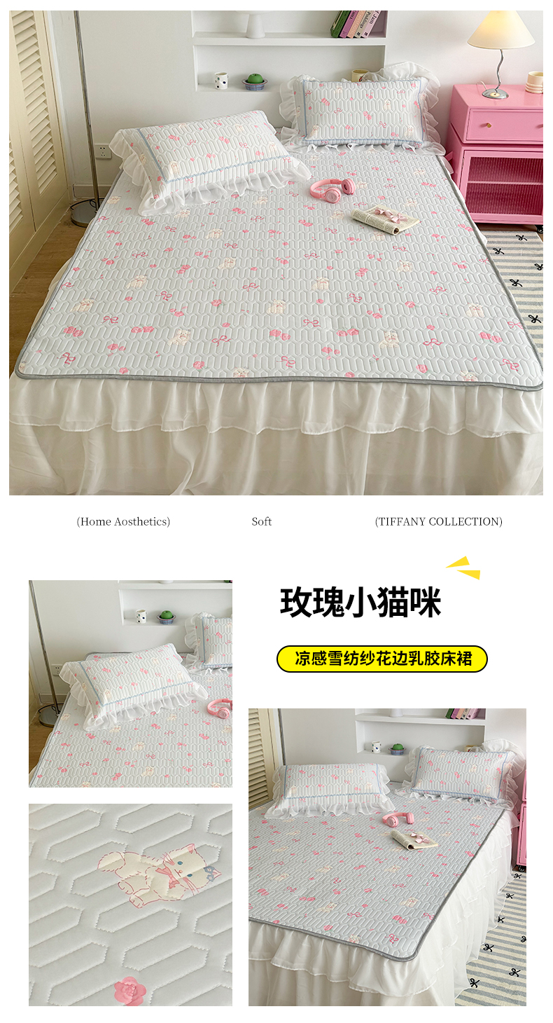 商品名称:昔可 新款床裙款乳胶凉席双层雪纺纱乳胶凉席三件套 玫瑰小猫咪