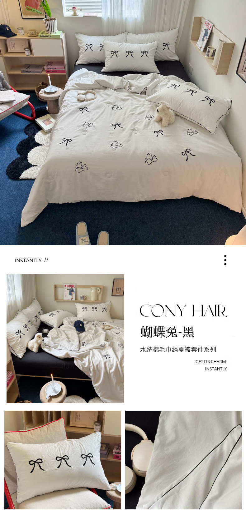 商品名称:花伞 2024新款INS小红书毛巾绣刺绣夏被四件套 蝴蝶兔-黑