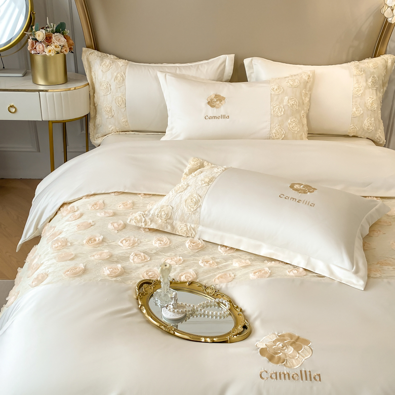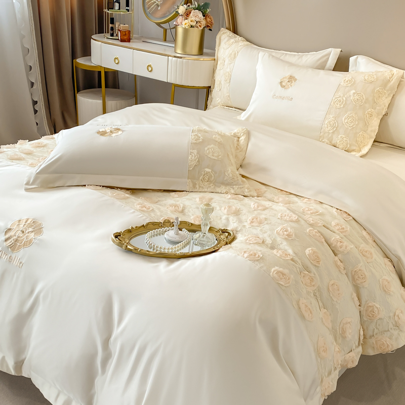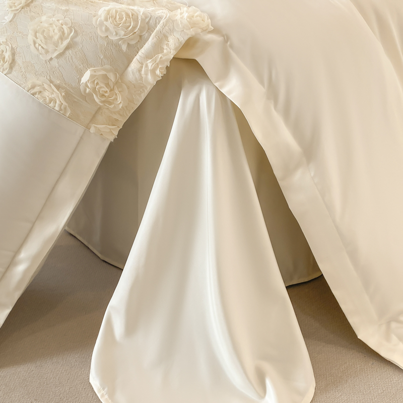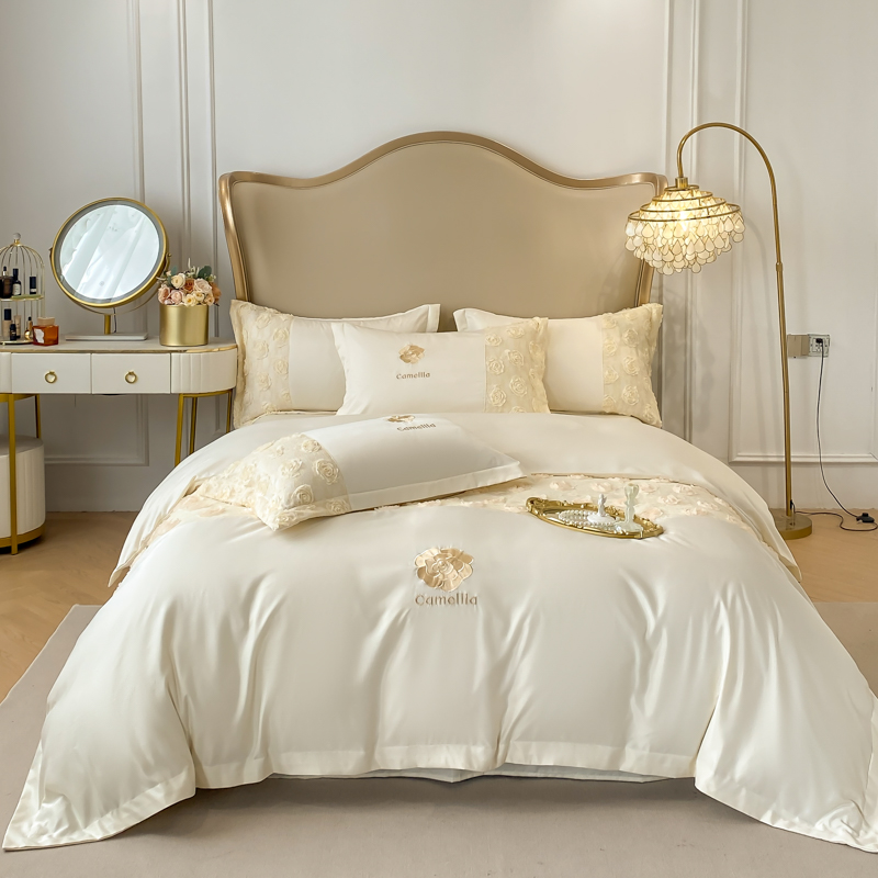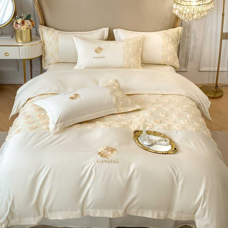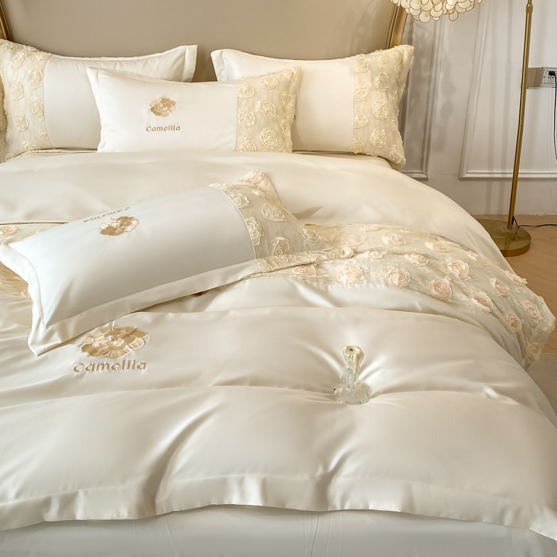 商品名称:红嘴企鹅 2025新款水洗真丝工艺款山茶花冰丝四件套 山茶花奶白