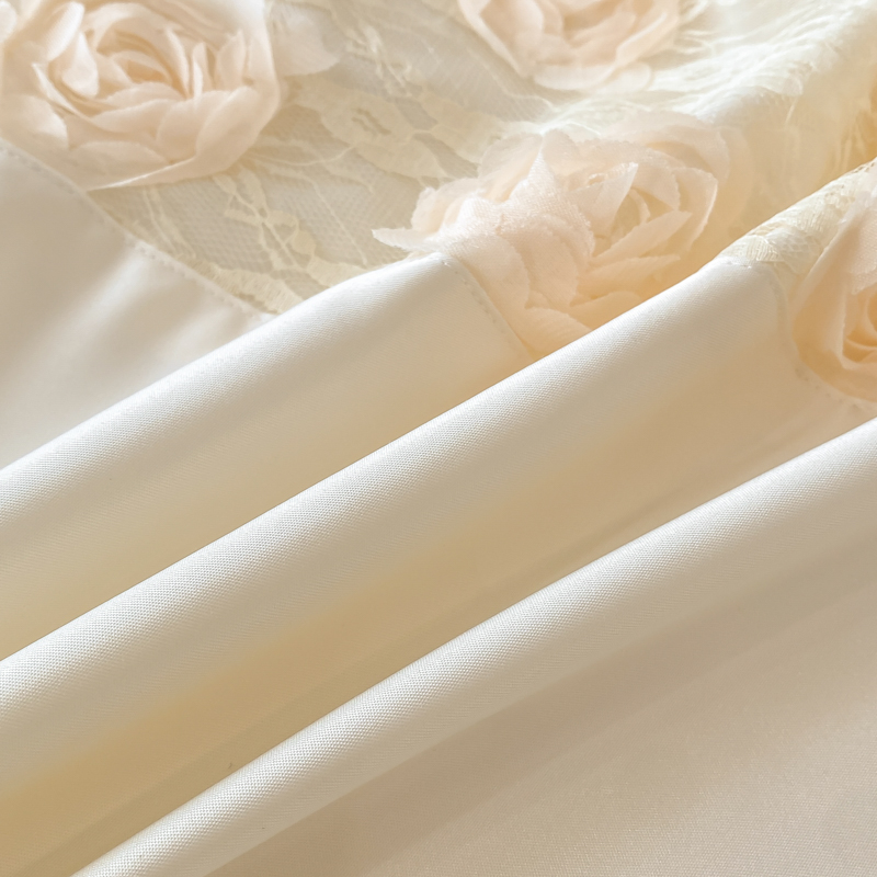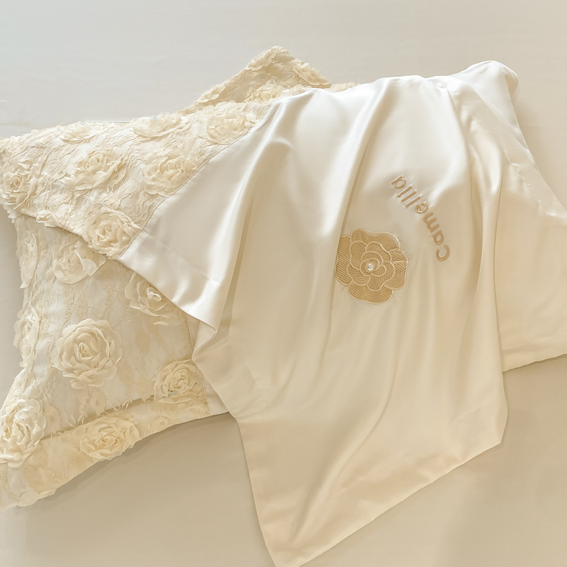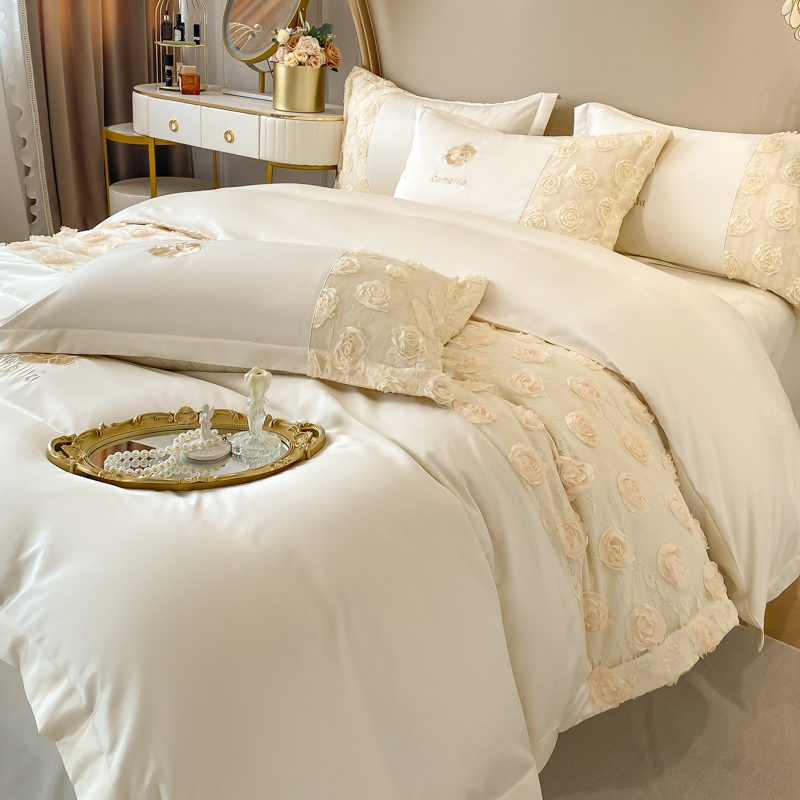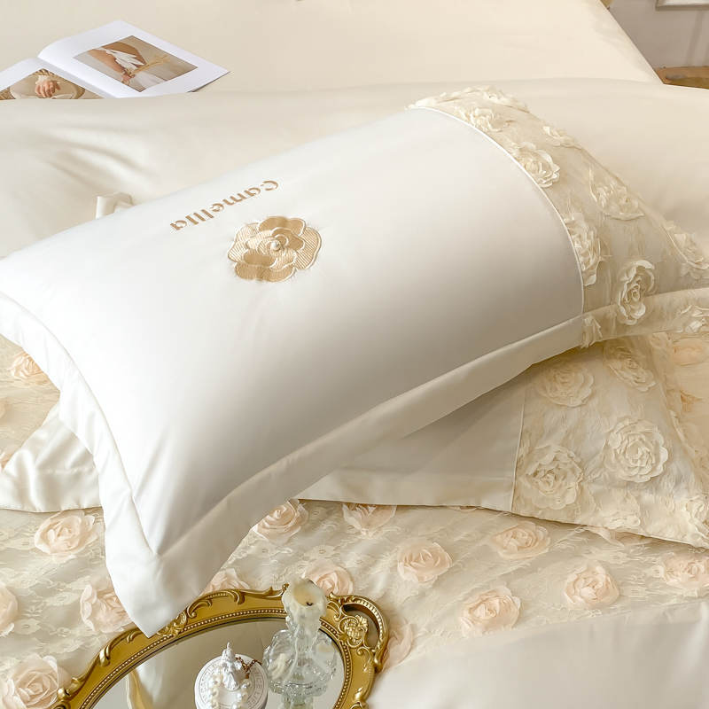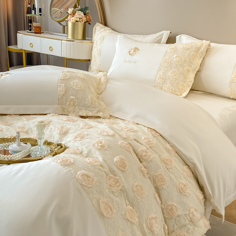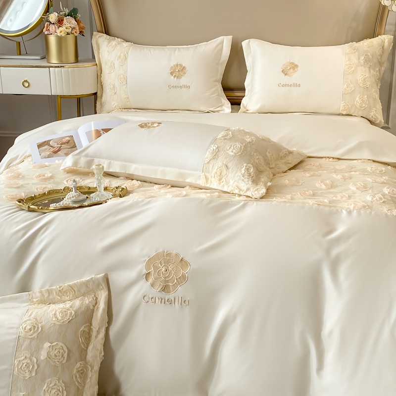 商品名称:红嘴企鹅 2025新款水洗真丝工艺款山茶花冰丝四件套 山茶花奶白