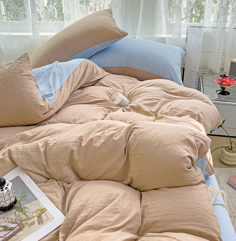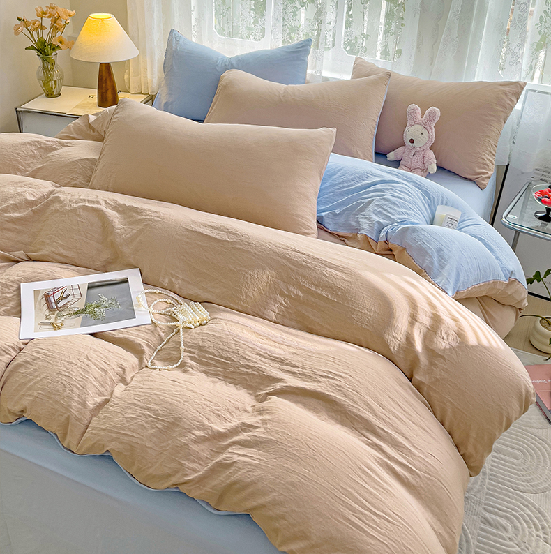 韩巢家纺 2024新款ins风超柔褶皱亲肤水洗棉被套单件-纯色双拼系列(提供卖家秀) 水洗棉咖蓝