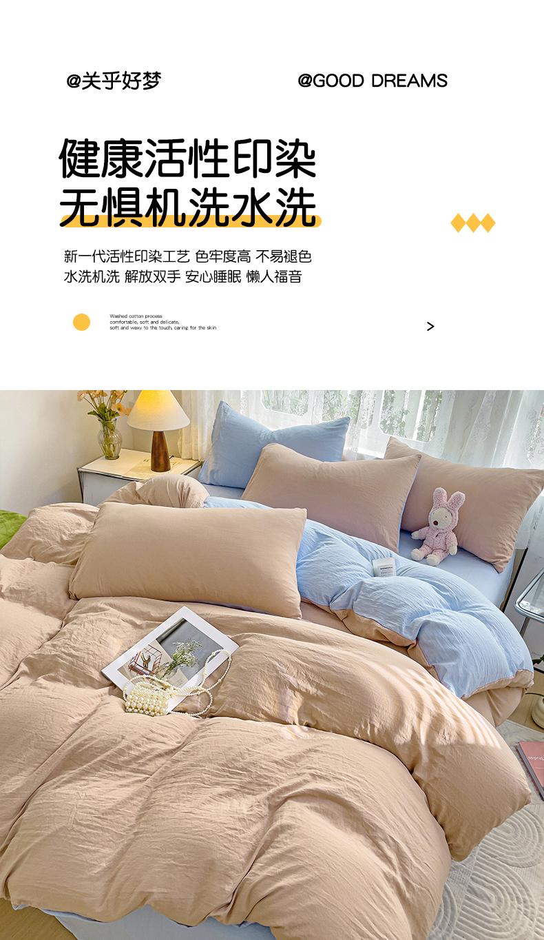 商品名称:韩巢家纺 2024新款ins风超柔褶皱亲肤水洗棉被套单件-纯色双拼系列(提供卖家秀) 水洗棉咖蓝