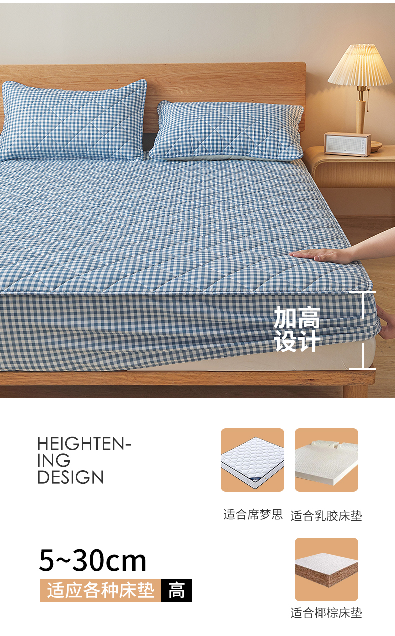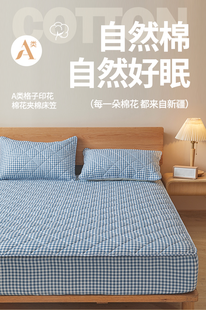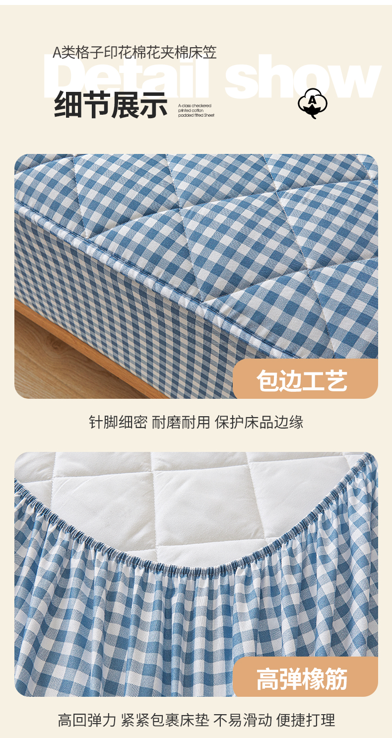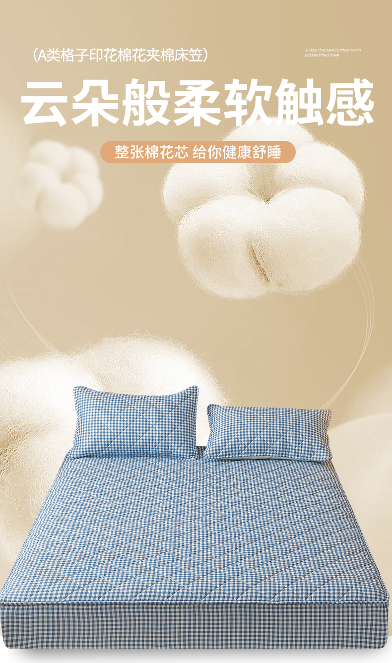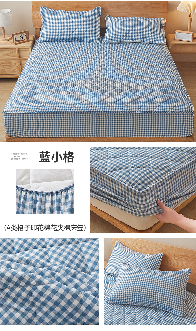 商品名称:多谷家纺 2024新款格子无印风系列棉花夹棉床笠 蓝小格