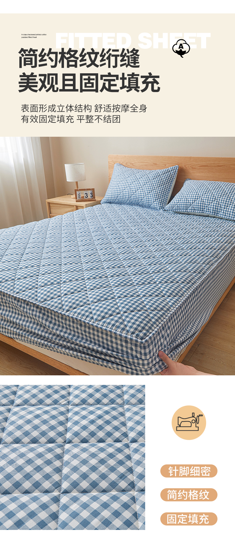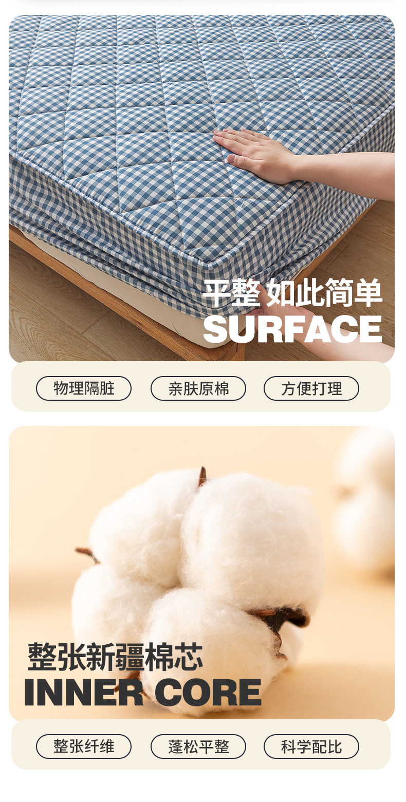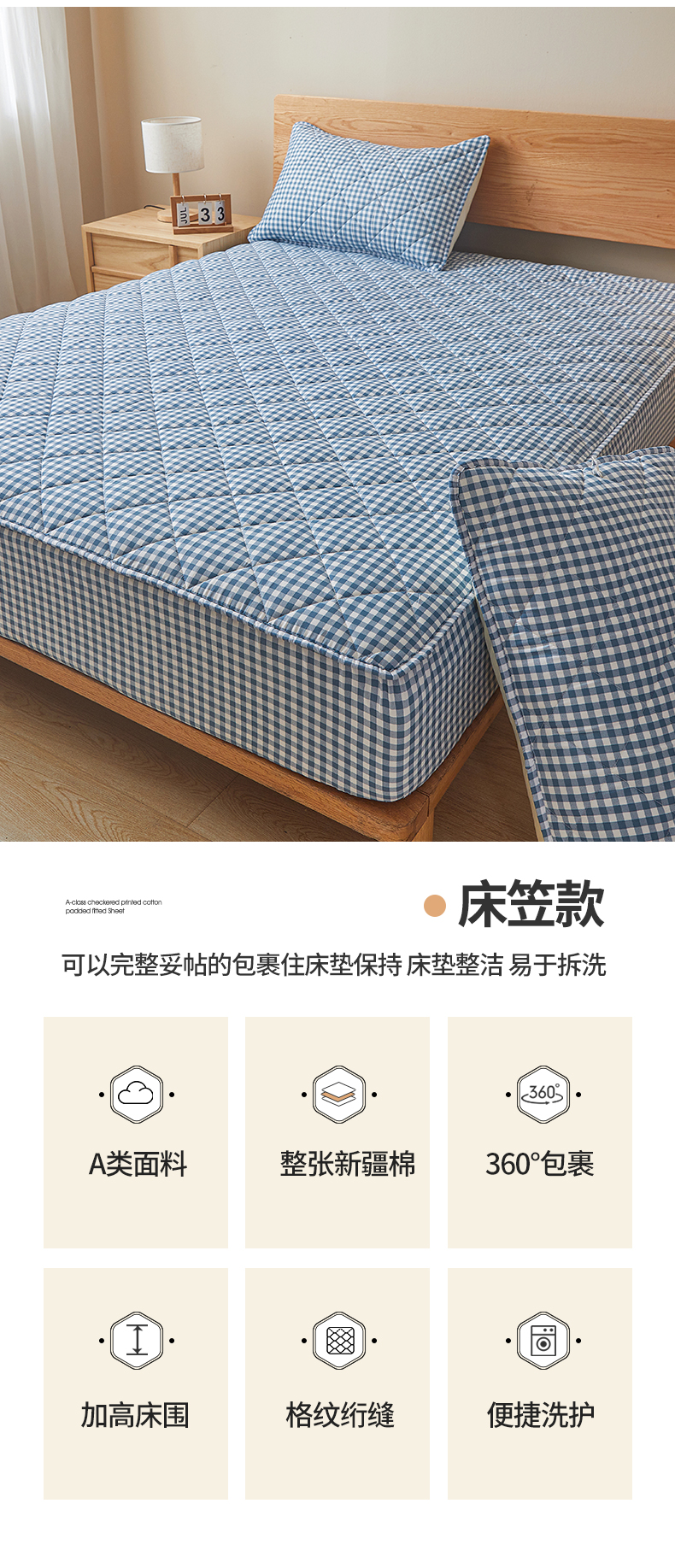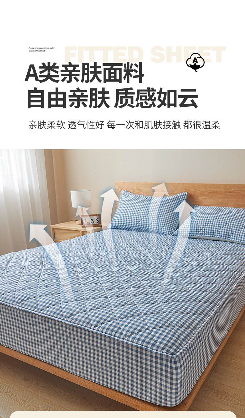 商品名称:多谷家纺 2024新款格子无印风系列棉花夹棉床笠 蓝小格