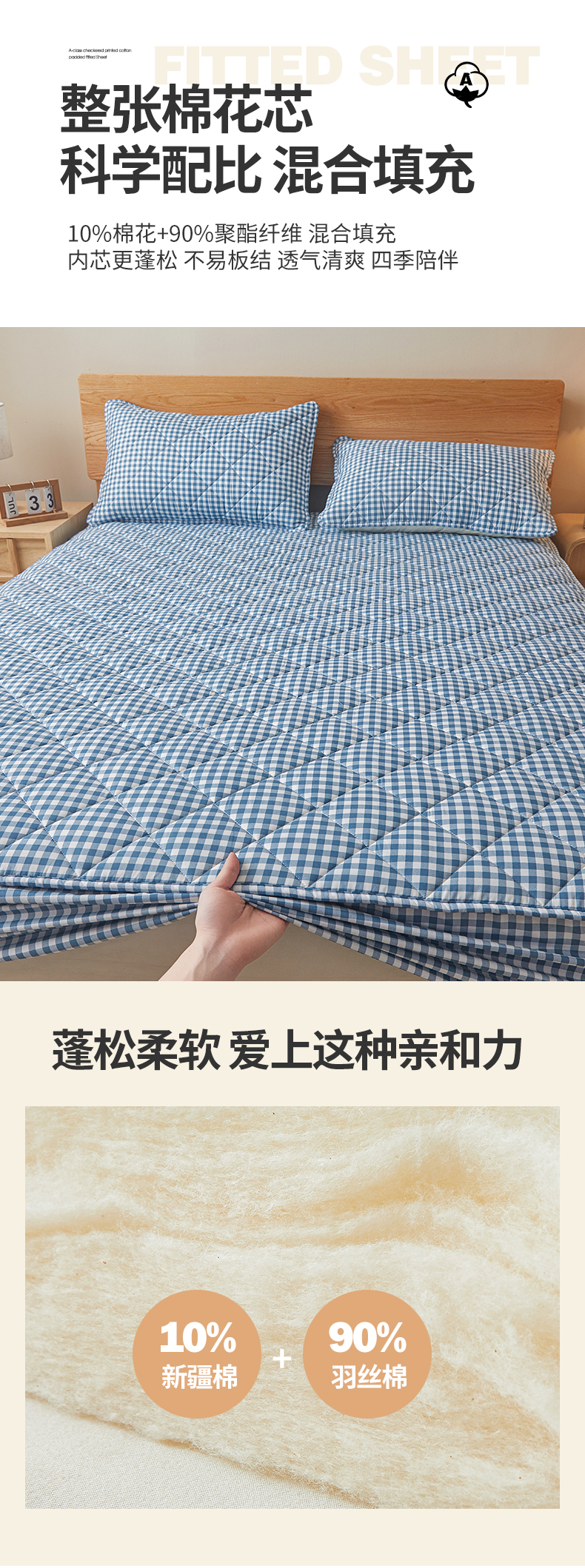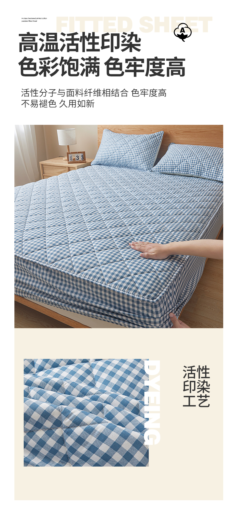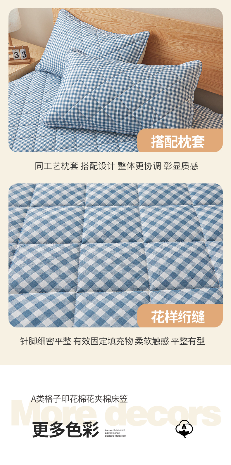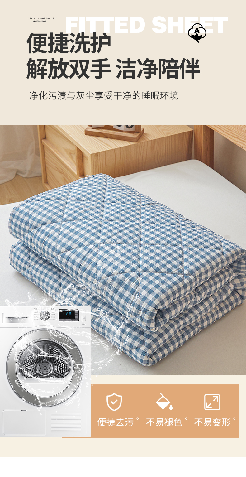 商品名称:多谷家纺 2024新款格子无印风系列棉花夹棉床笠 蓝小格
