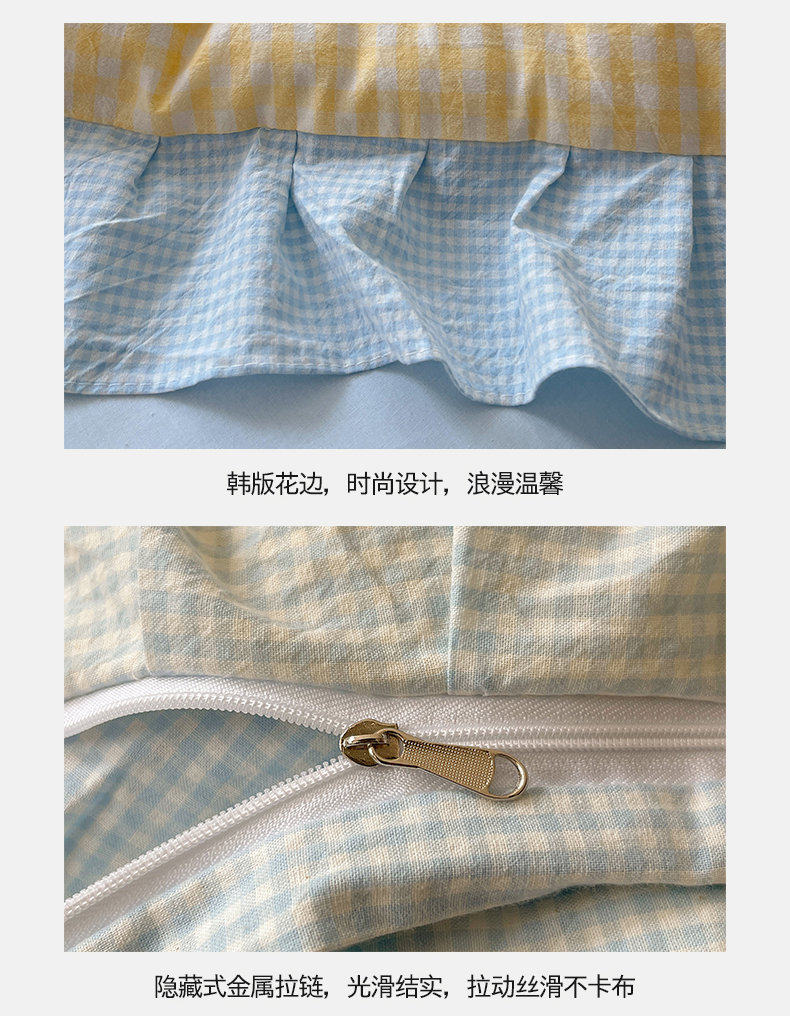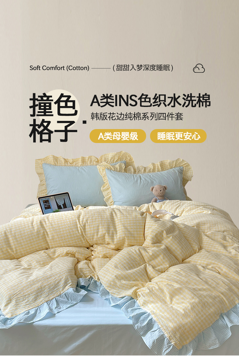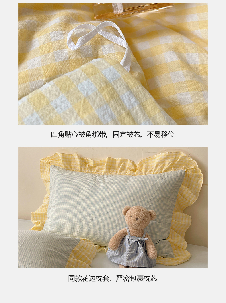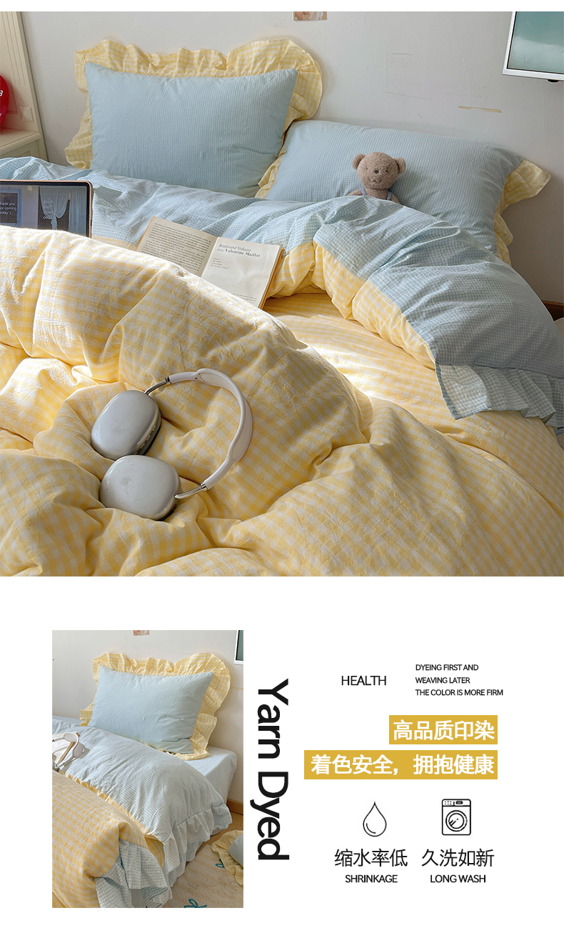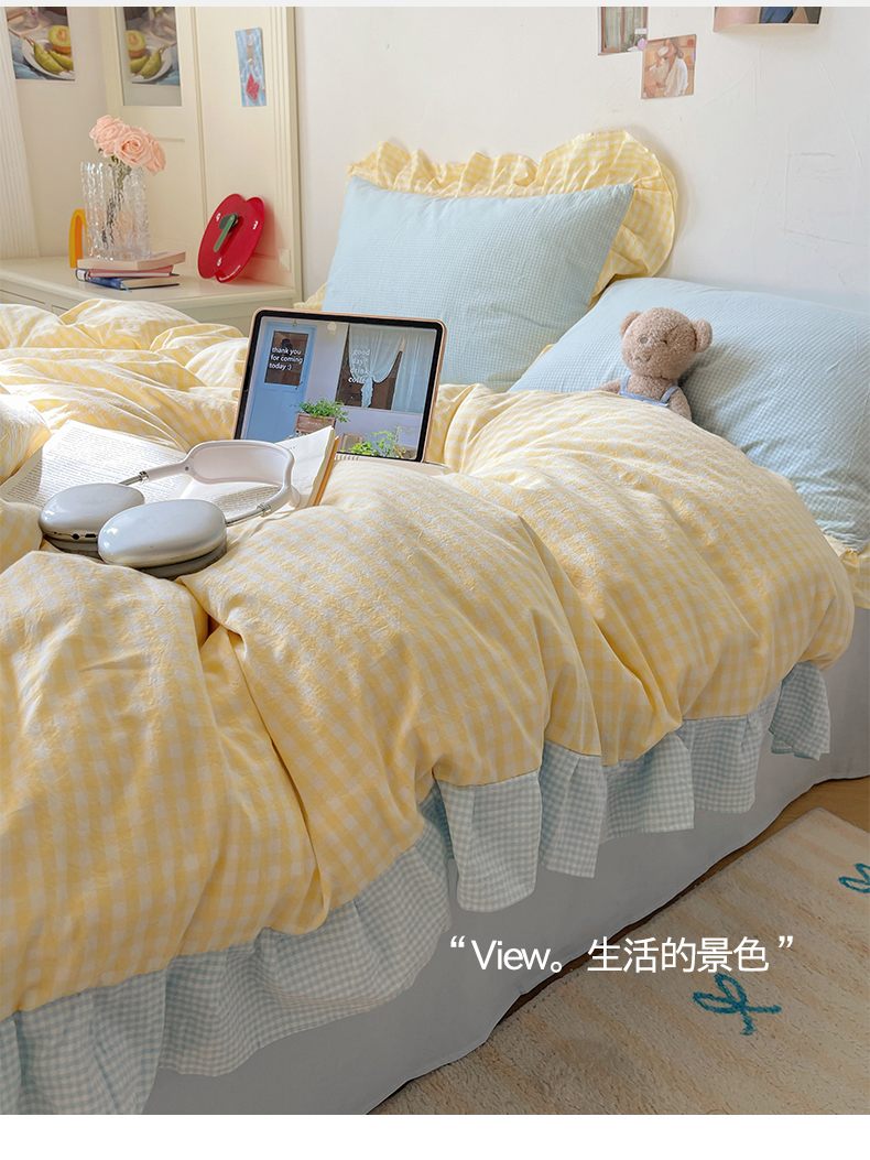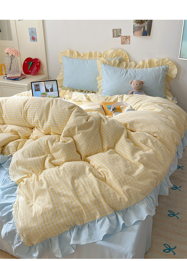 当前位置: 91家纺网 > 商品网购 > 床品套件 > 四件套 > 全棉普通四件套 > 桃子家居 2024新款A类ins色织水洗棉花边撞色玛卡龙格子韩版花边纯棉系列四件套 水洗棉花边-芒果黄蓝