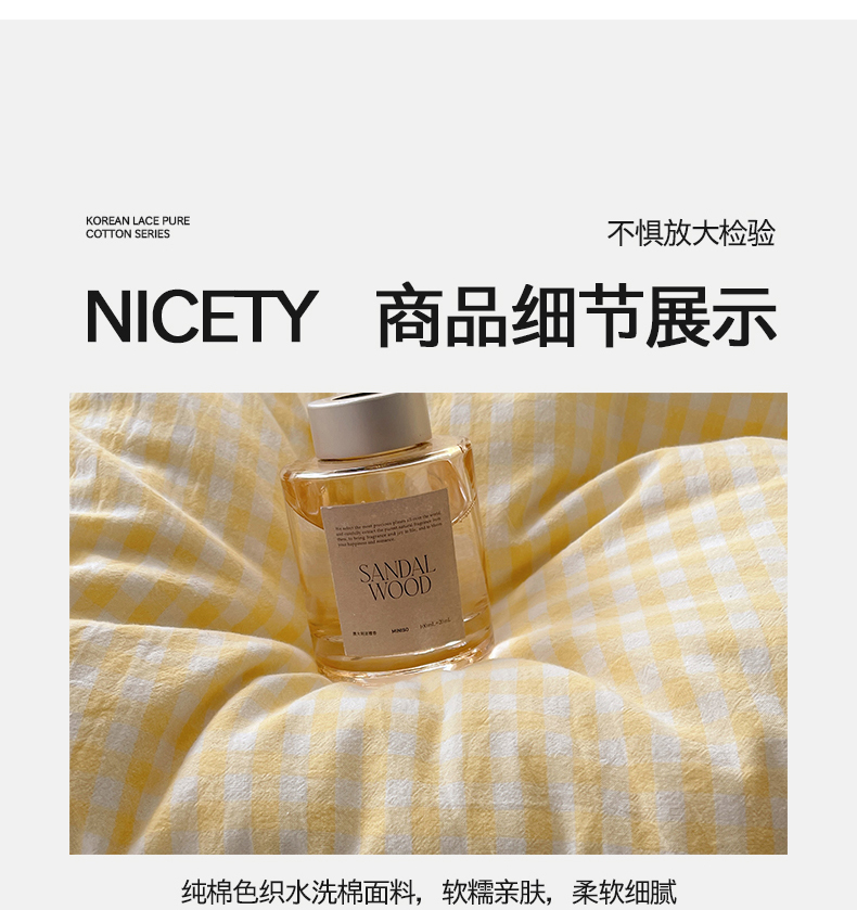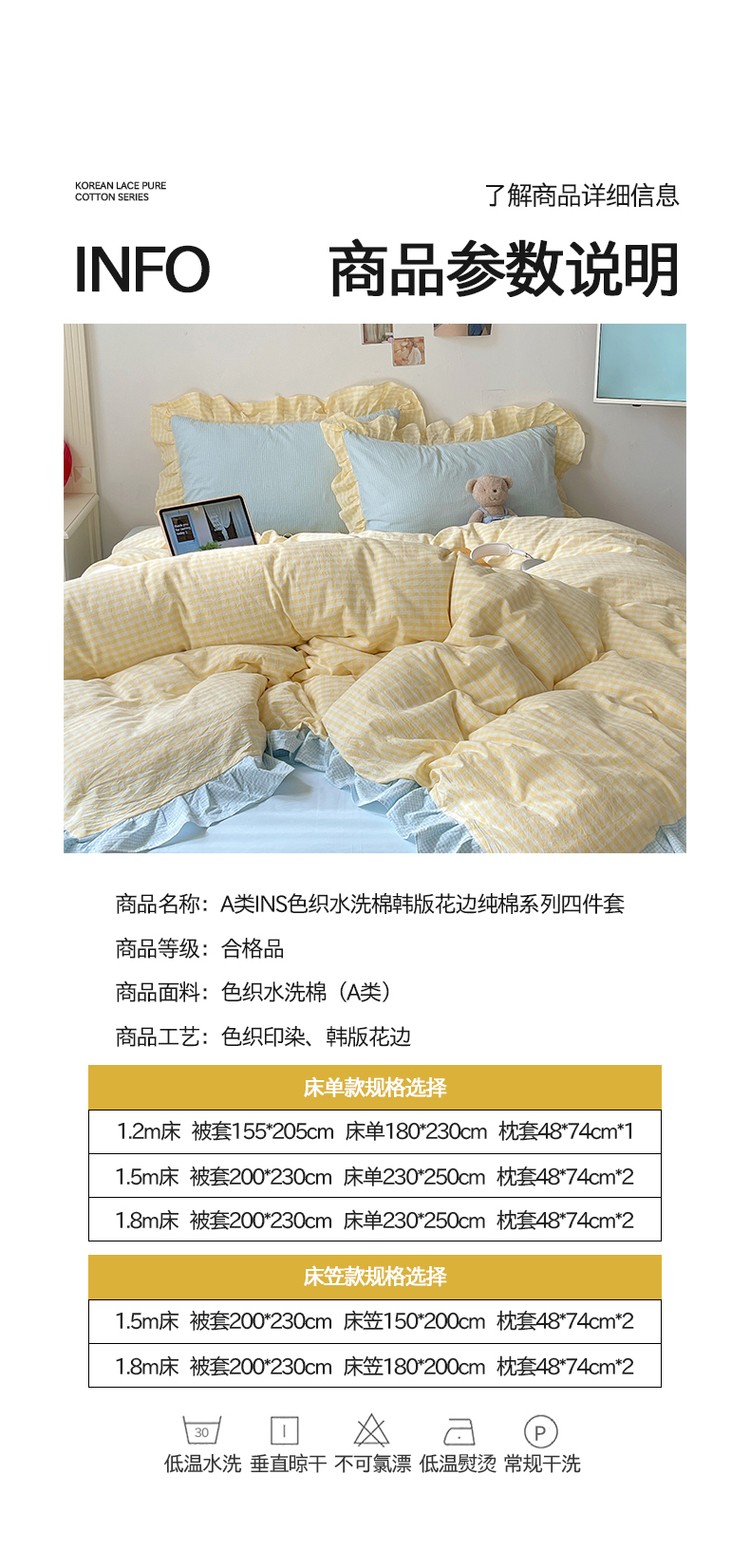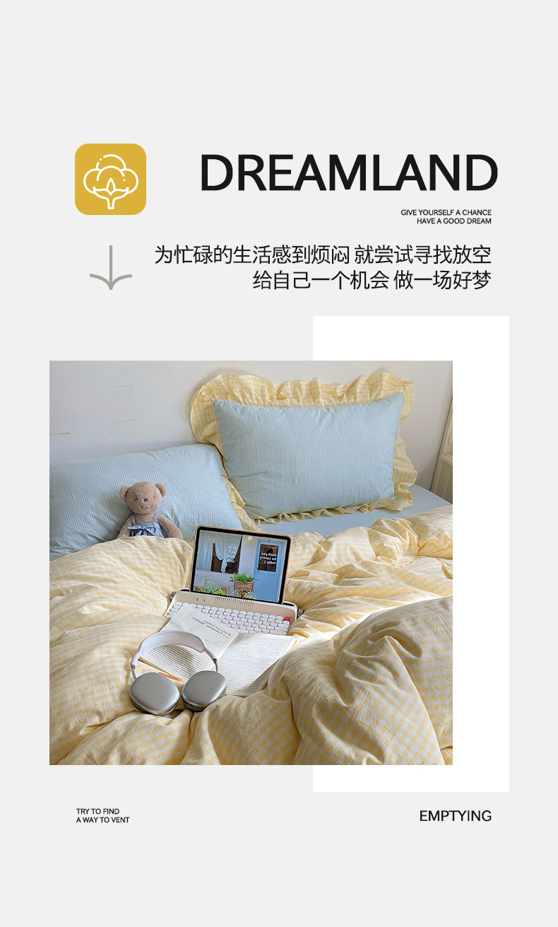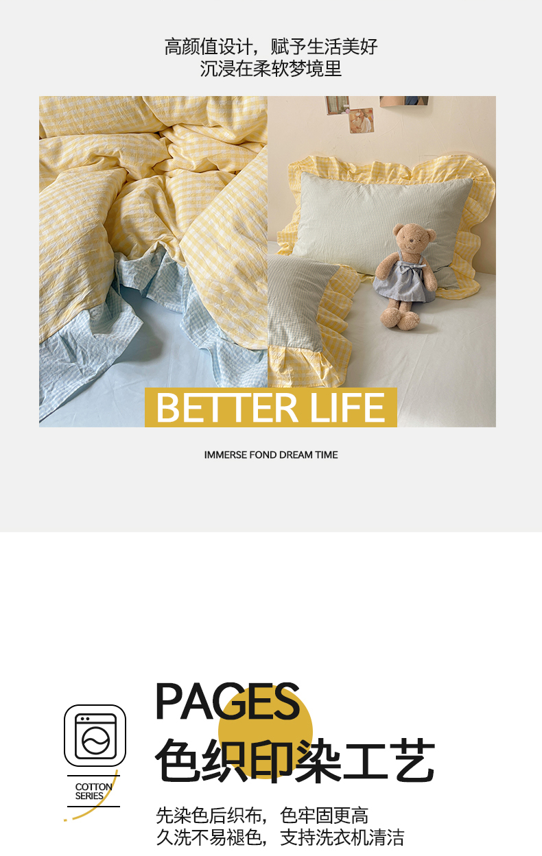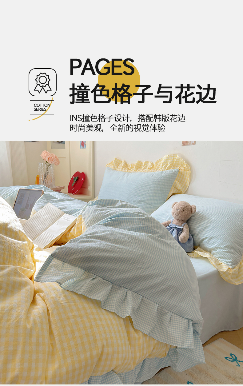 当前位置: 91家纺网 > 商品网购 > 床品套件 > 四件套 > 全棉普通四件套 > 桃子家居 2024新款A类ins色织水洗棉花边撞色玛卡龙格子韩版花边纯棉系列四件套 水洗棉花边-芒果黄蓝
