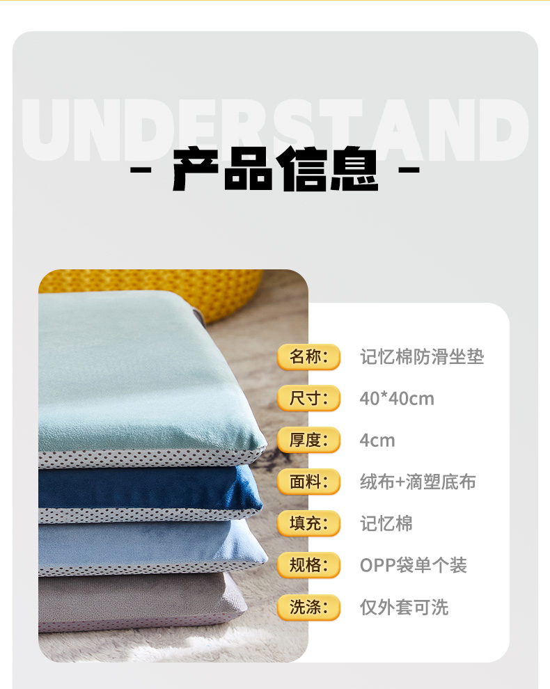 当前位置: 91家纺网 > 商品网购 > 居家布艺 > 坐垫/椅垫/沙发垫 > 椅垫 > 囍莱家纺 2024新款记忆棉防滑坐垫ZD-C039 椰子灰