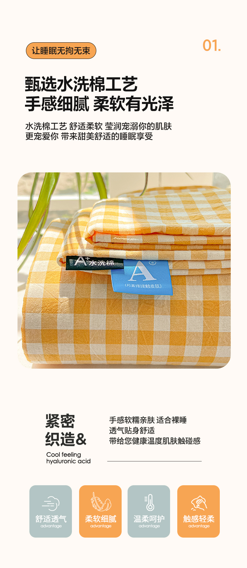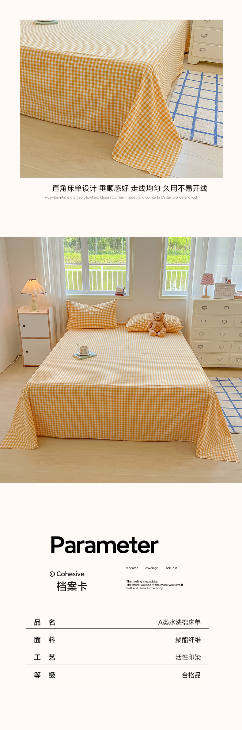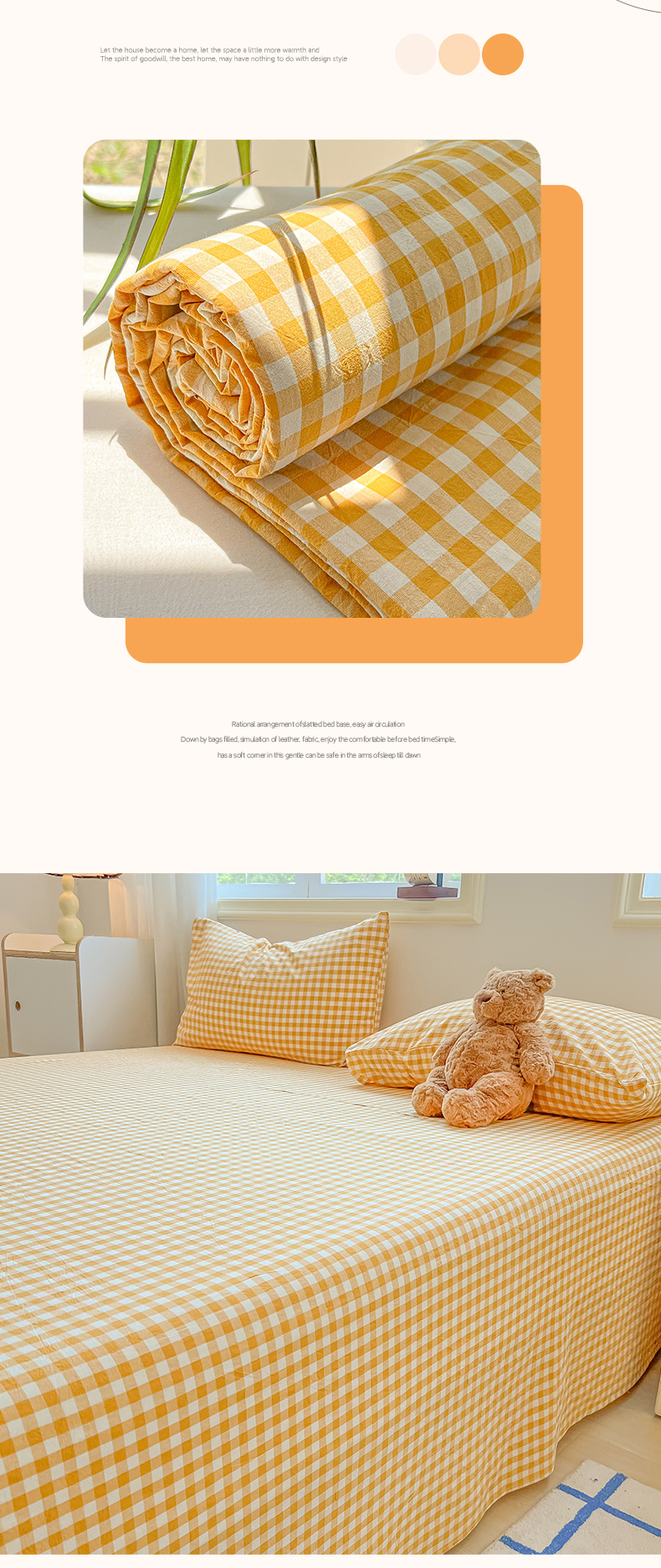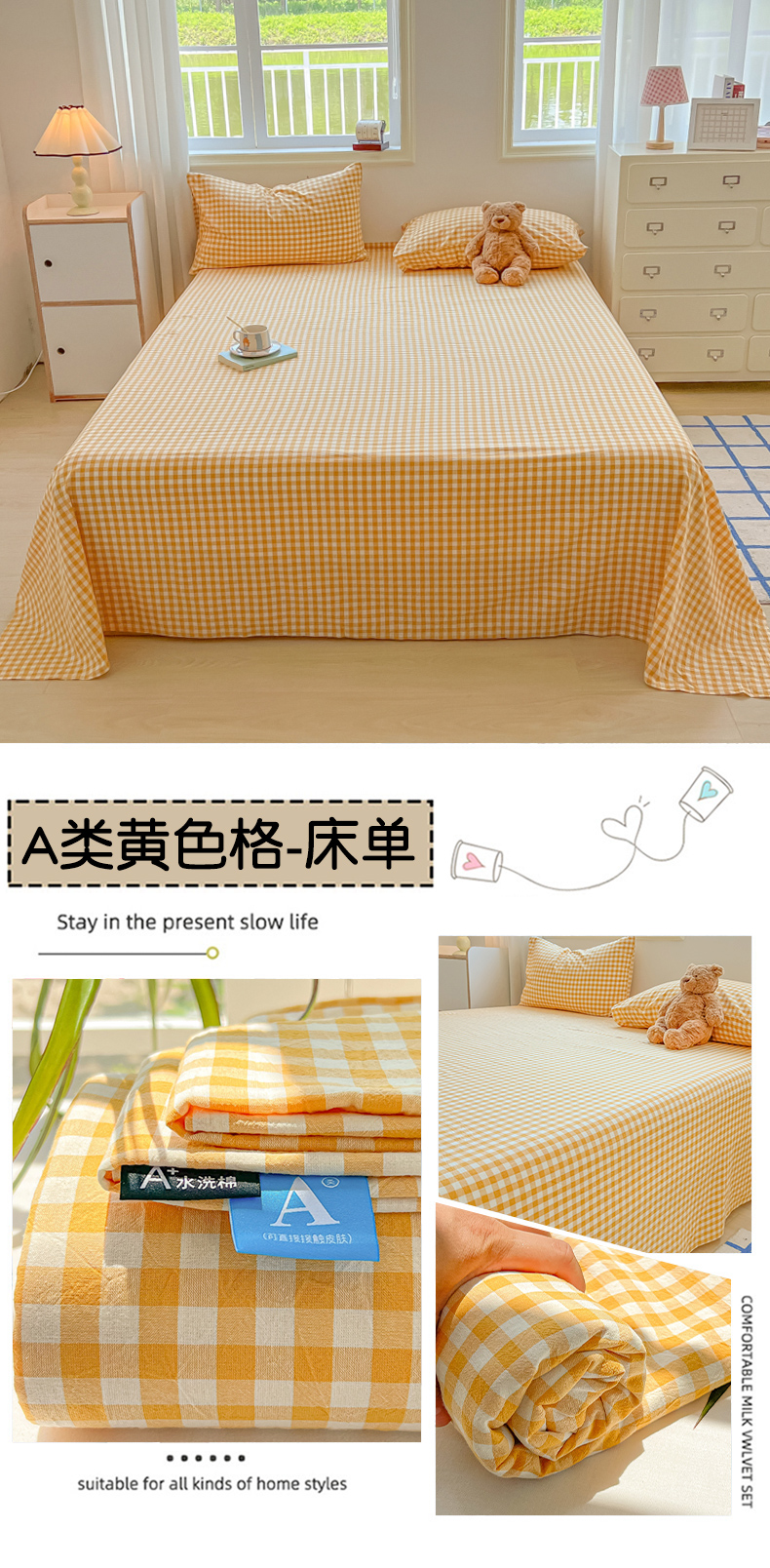 韩巢家纺 2024新款简约格子纯色A类水洗棉床单枕套三件套 A类黄色格-床单