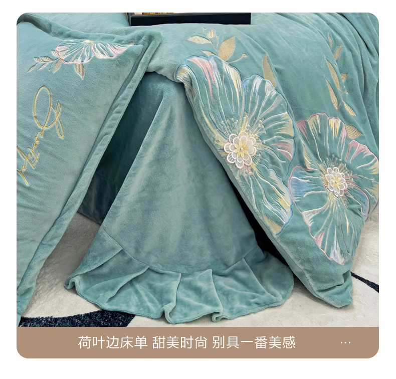 (总)星尚家纺 2024新款加厚保暖全消光牛奶绒夹棉床裙四件套-玫瑰之恋,粉玉,寐紫,浅蓝,水绿