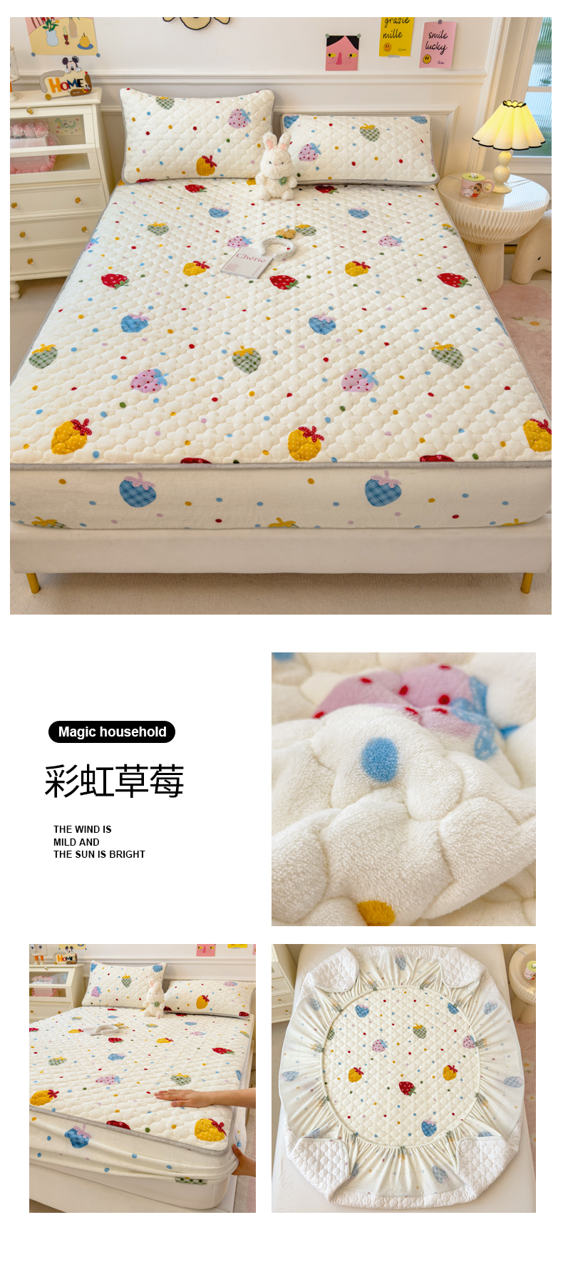 • 91家纺网 家纺一手货源 找家纺 丝羽坊 2024新款A类加厚牛奶绒夹棉床笠 彩虹草莓