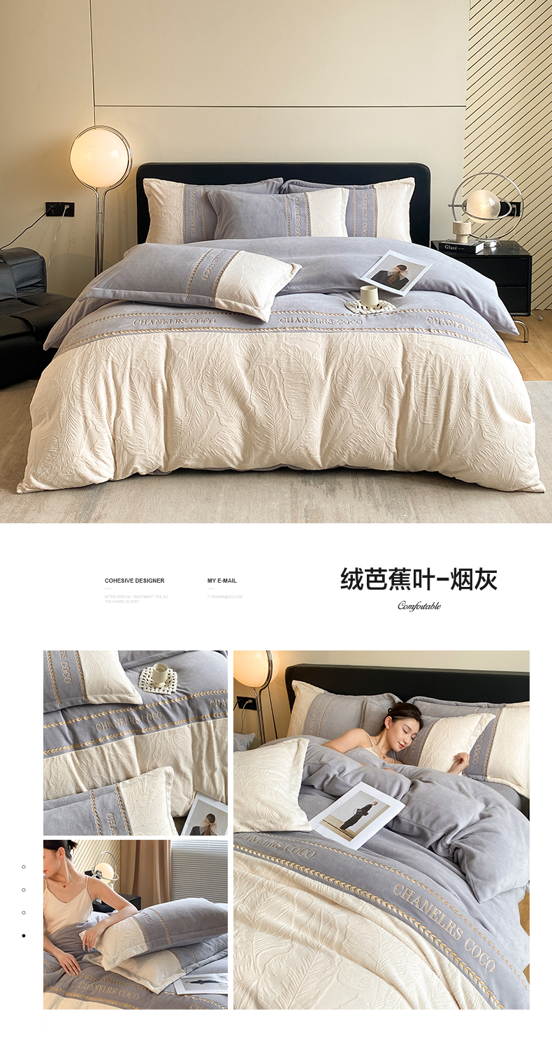 商品名称:宇航家纺 2025新款轻奢风芭蕉叶牛奶绒绣花四件套(提供买家秀) 绒芭蕉叶烟灰