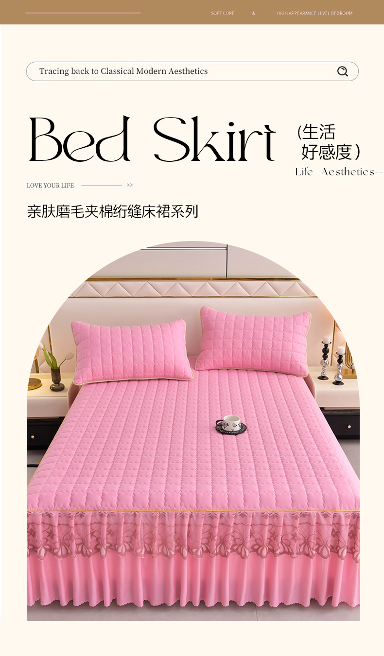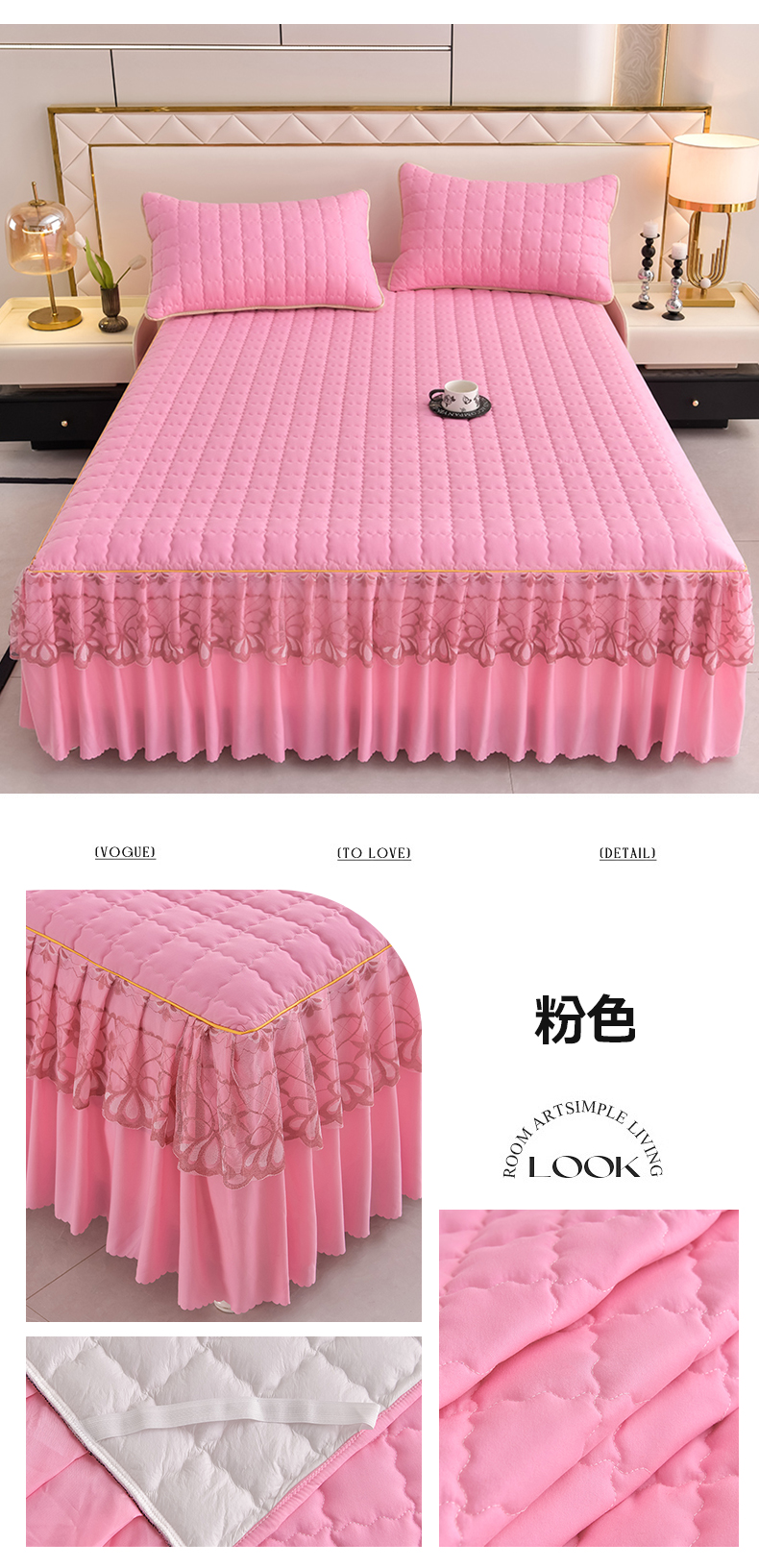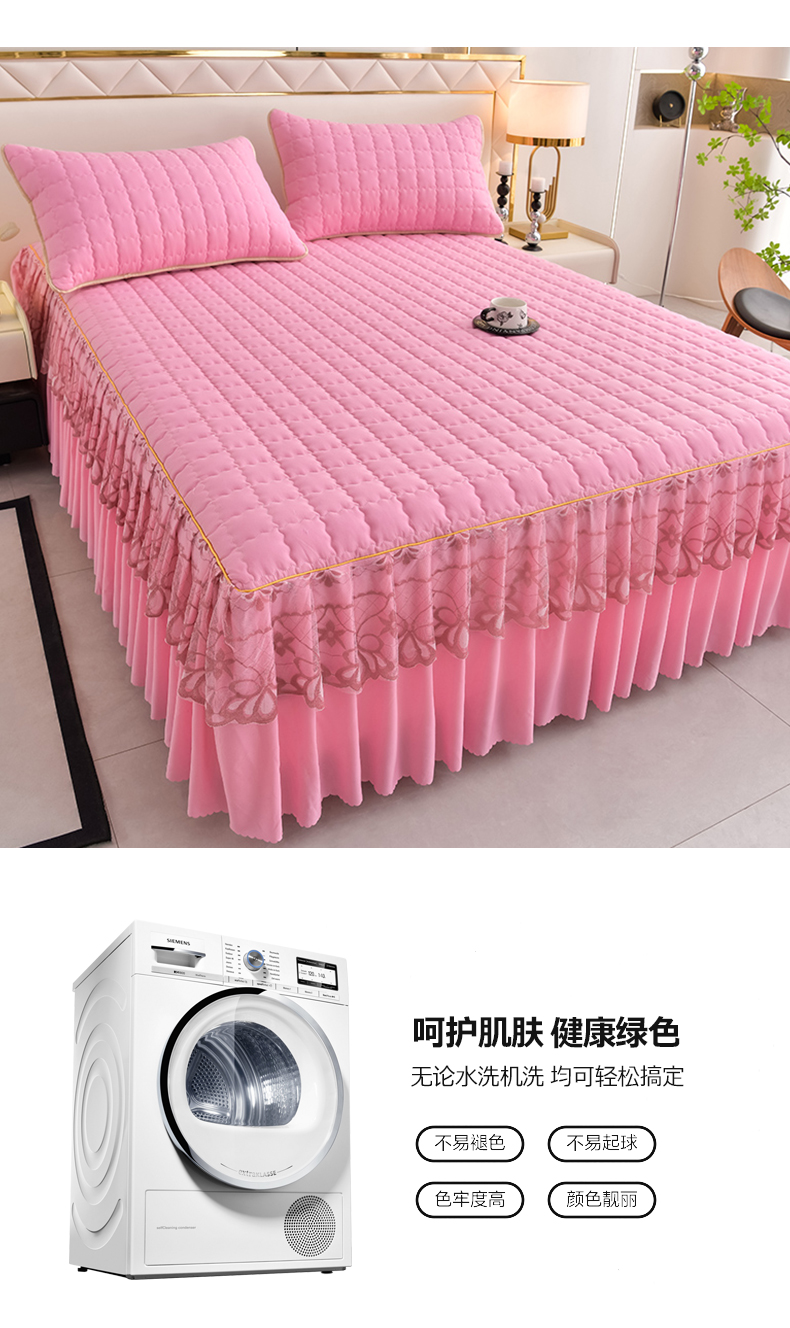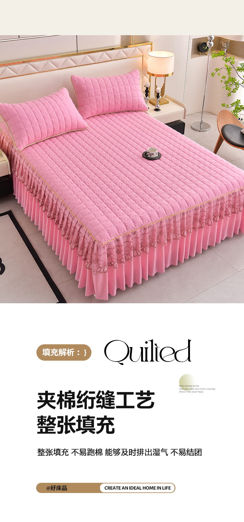 艾裙海 2025新款90克磨毛夹棉绗缝床裙 粉色