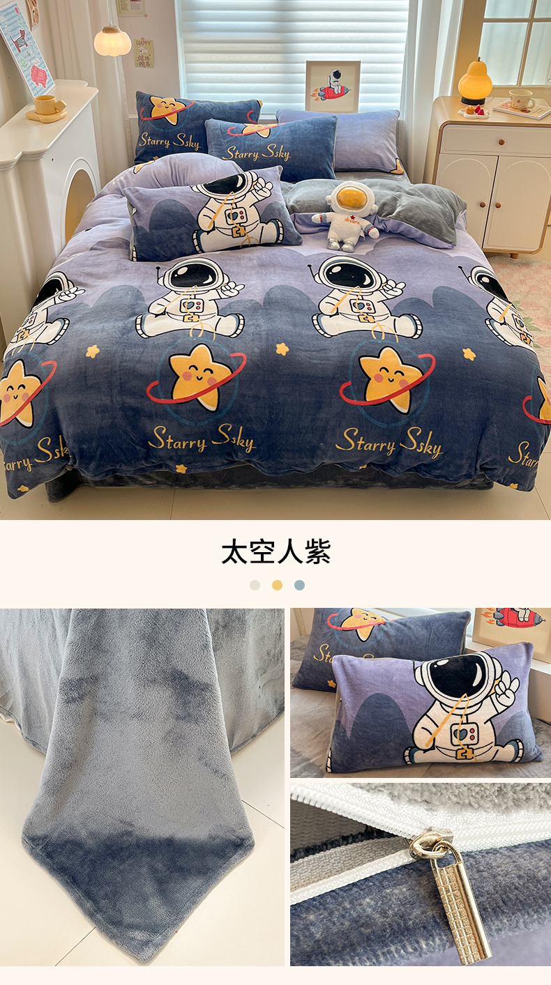 当前位置: 91家纺网 > 商品网购 > 床品套件 > 四件套 > 牛奶绒四件套 > 孩子王家纺 2025新款小清新冬季加厚牛奶绒水晶绒珊瑚绒印花系列四件套 太空人紫
