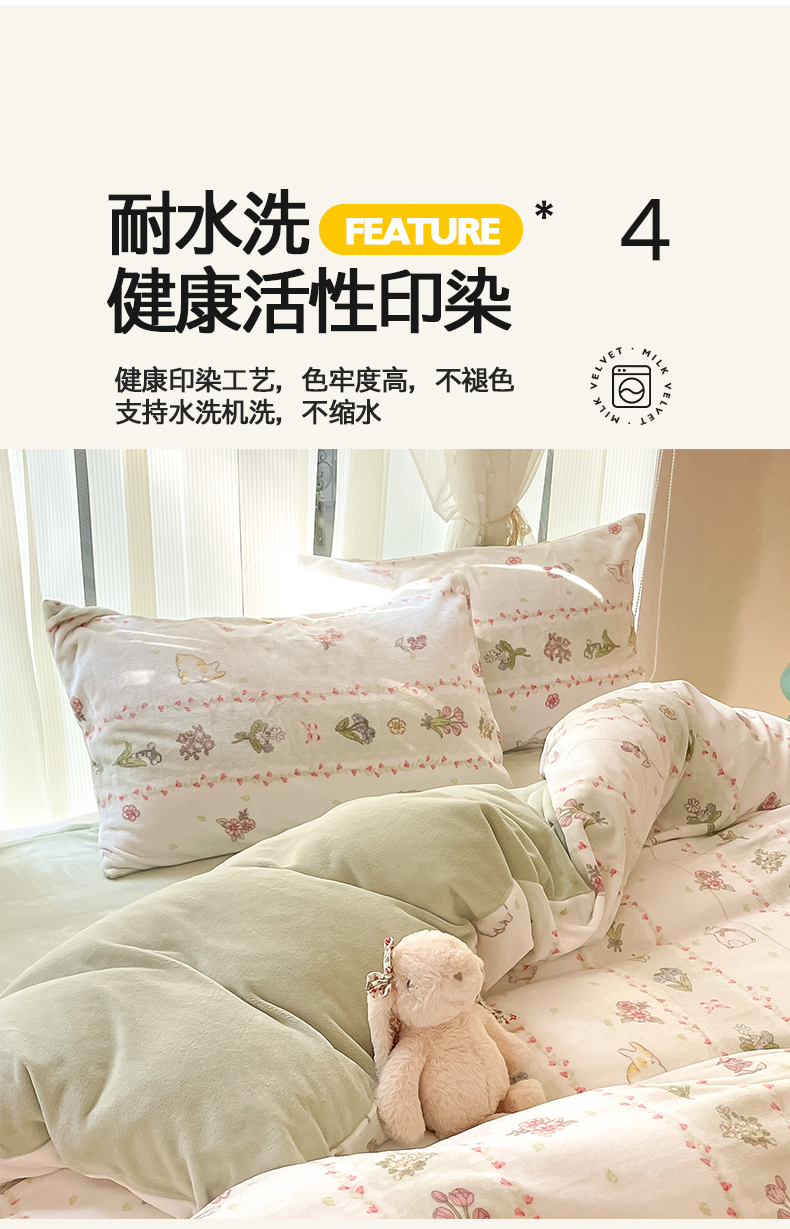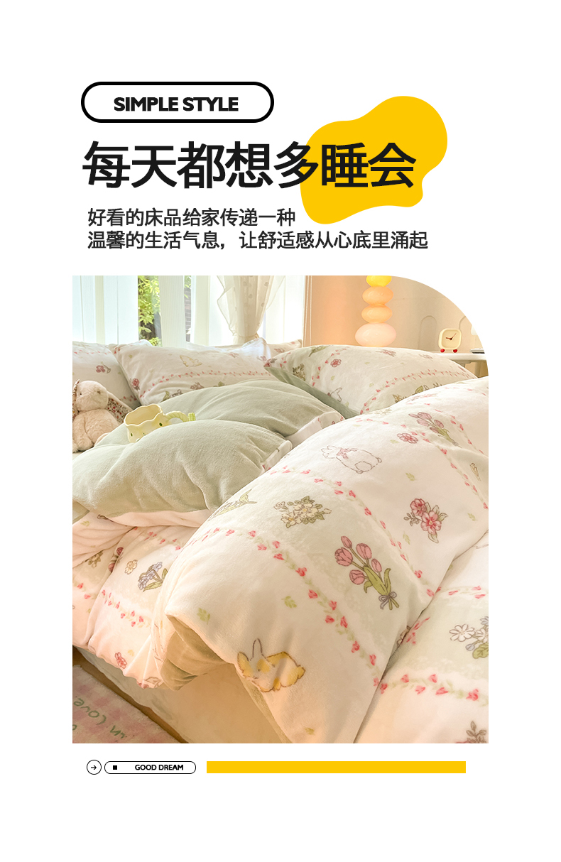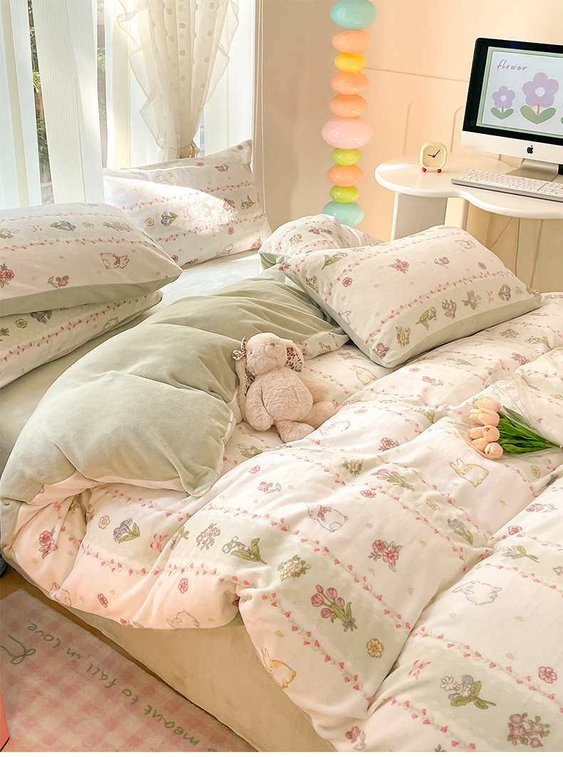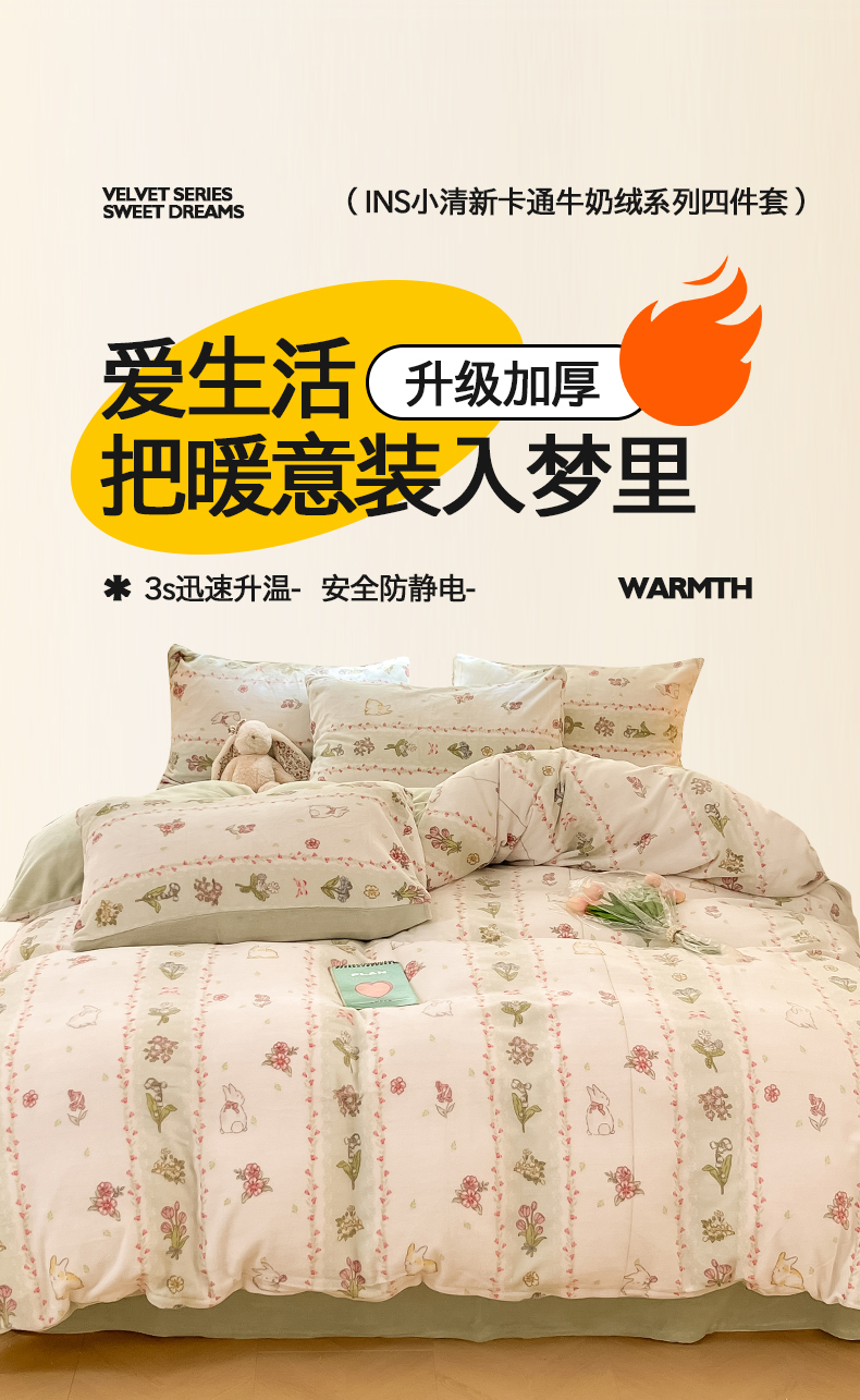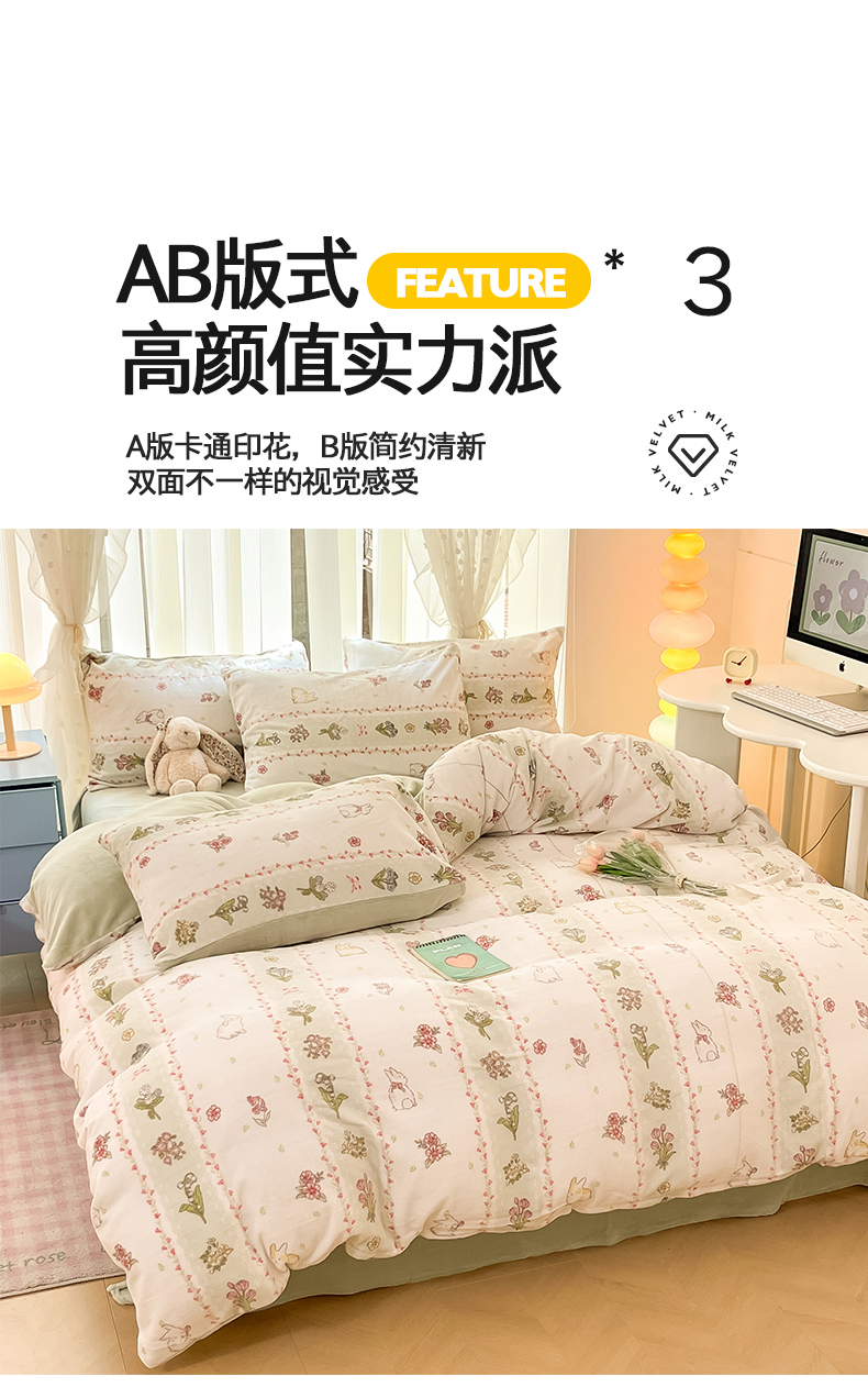 桃子家居 2024新款ins小清新花卉少女卡通跑量牛奶绒系列四件套 绒-花园小兔