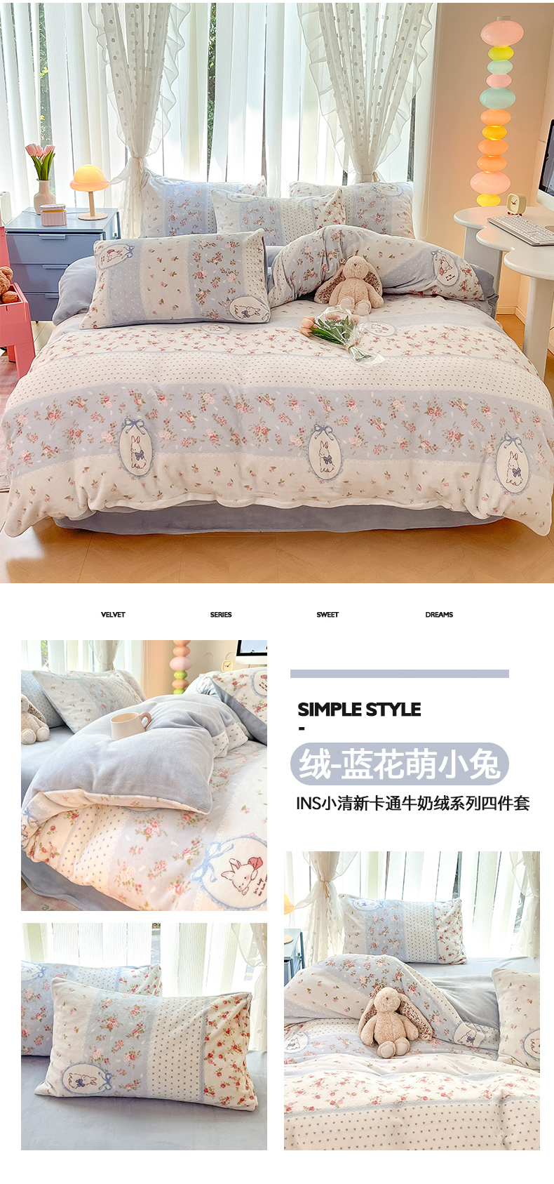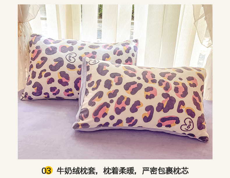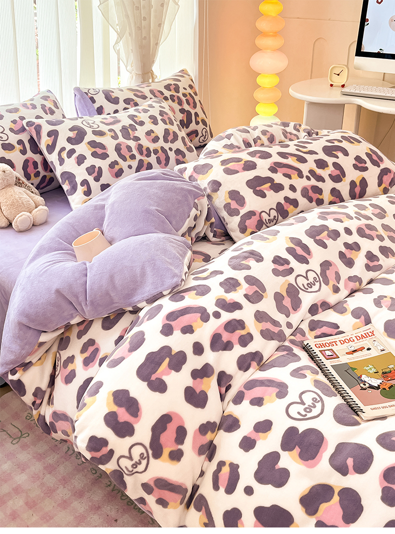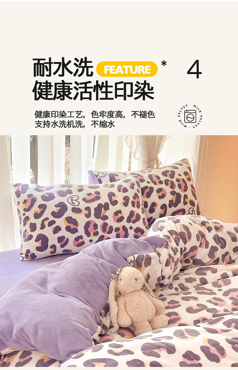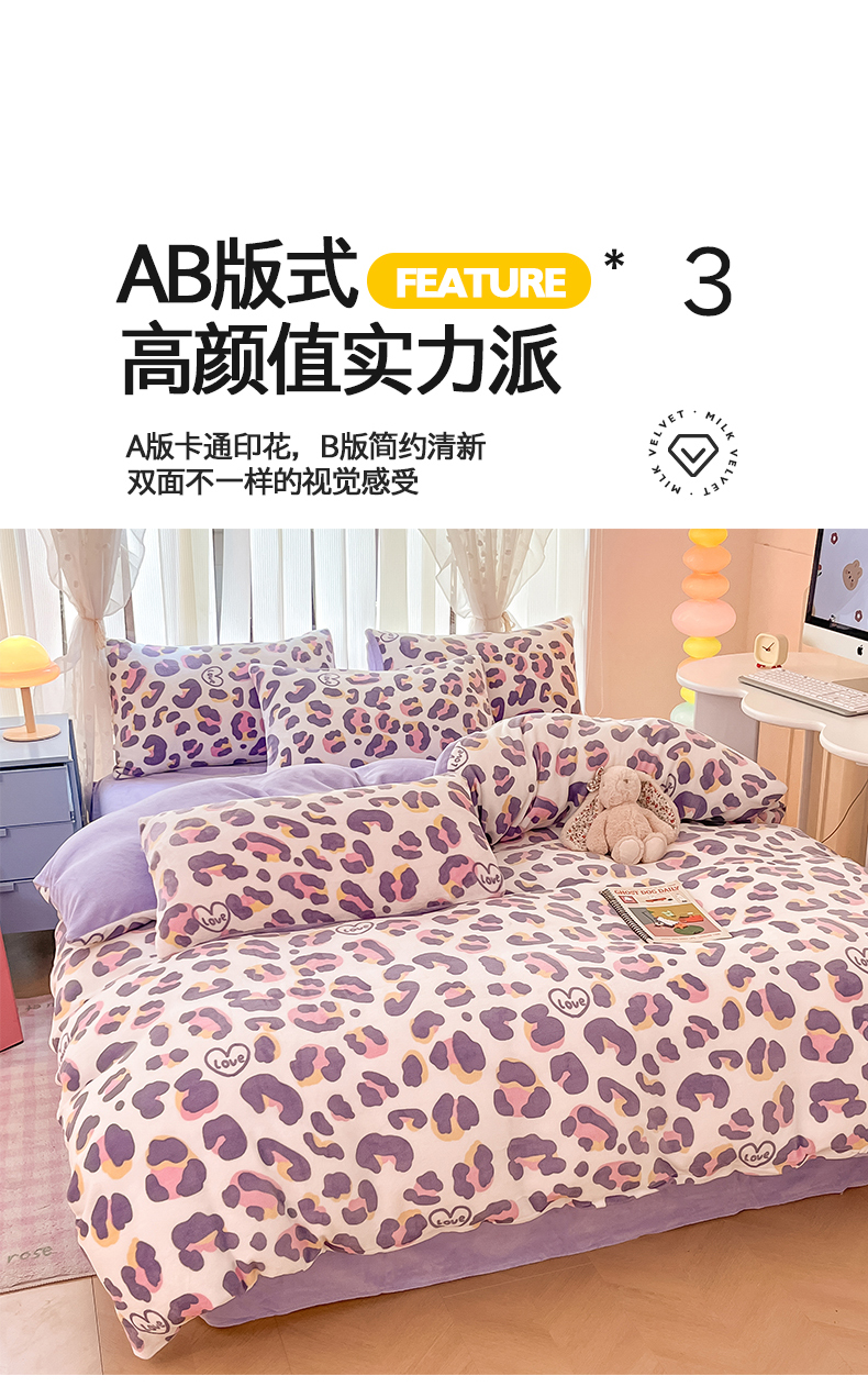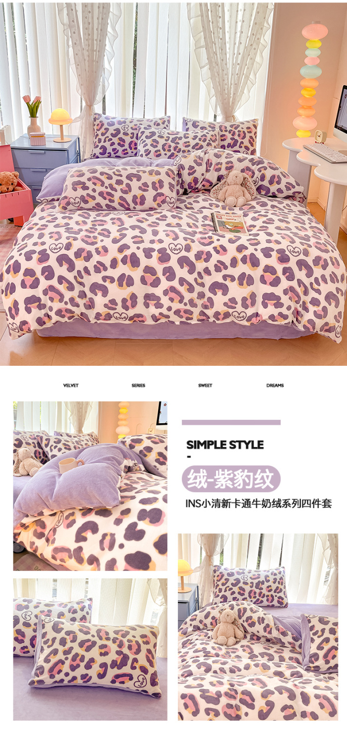 桃子家居 2024新款ins小清新花卉少女卡通跑量牛奶绒系列四件套 绒-紫豹纹