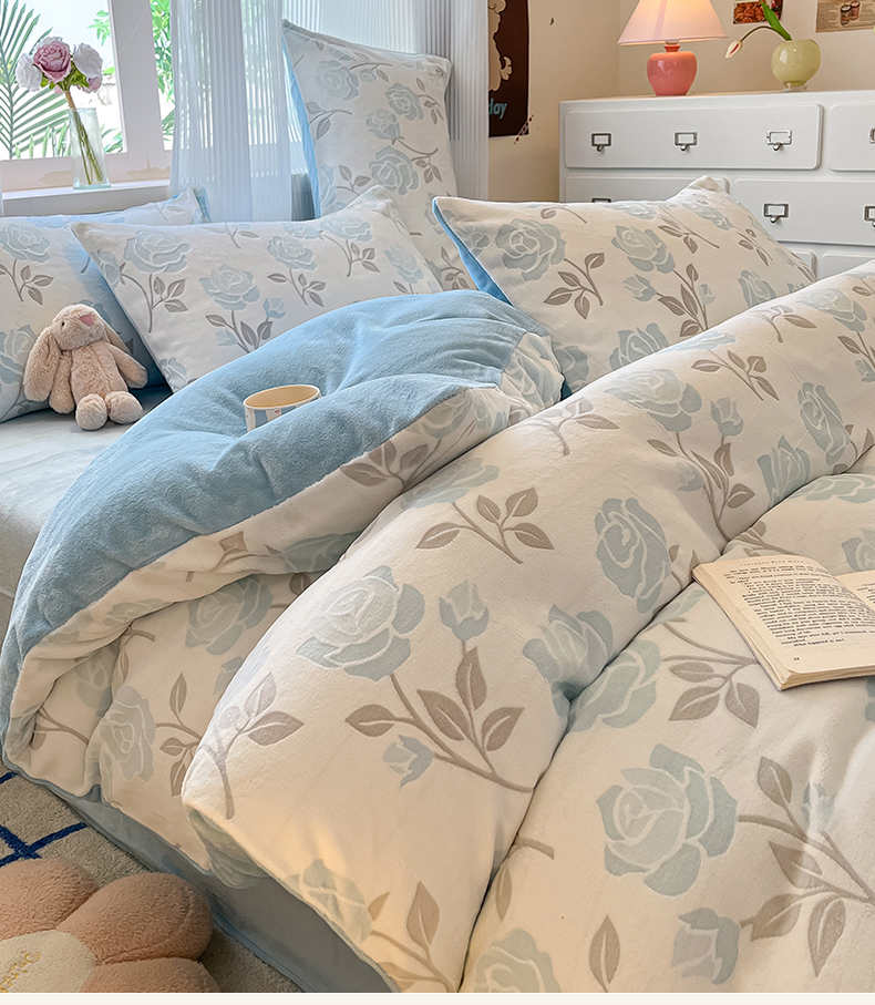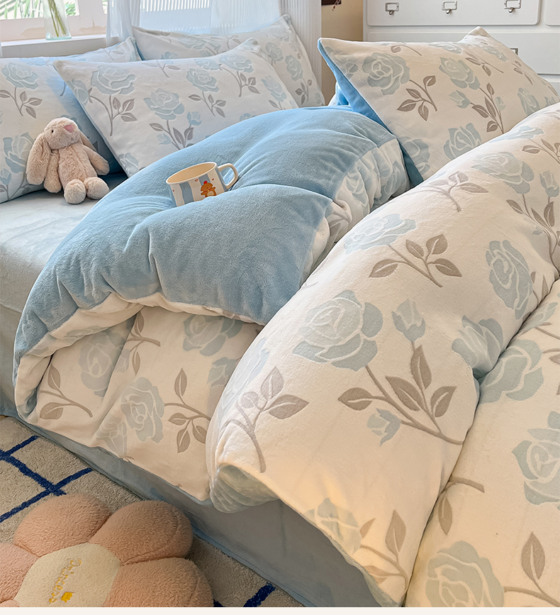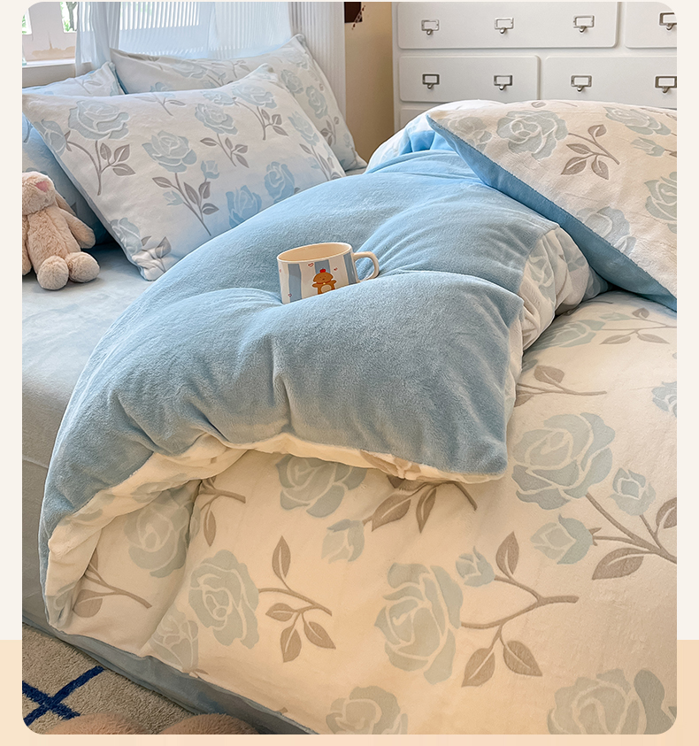 高克重上色立体雕花牛奶绒着色烂花四件套宝宝绒婴儿绒秋冬加厚法兰绒珊瑚绒三件套 觅恋-蓝
