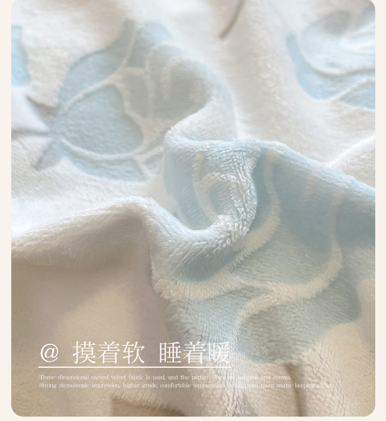 商品名称:高克重上色立体雕花牛奶绒着色烂花四件套宝宝绒婴儿绒秋冬加厚法兰绒珊瑚绒三件套 觅恋-蓝