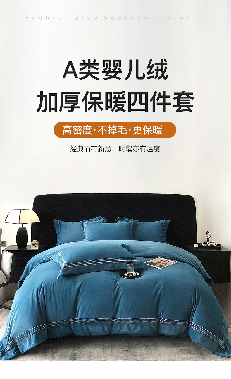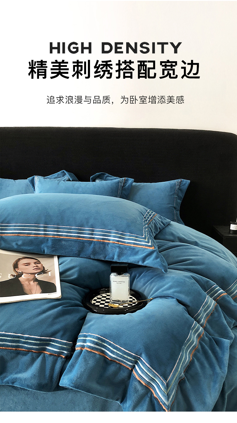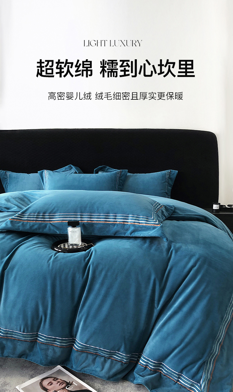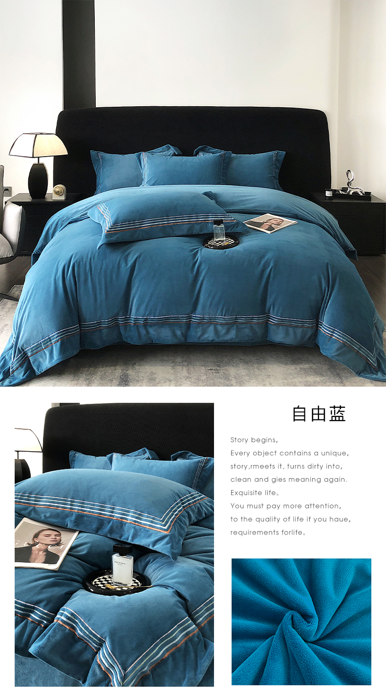 商品名称:禧澜庭2024新款A类婴儿绒宝宝绒纯色刺绣牛奶绒法莱绒法兰绒四件套 星河—自由蓝
