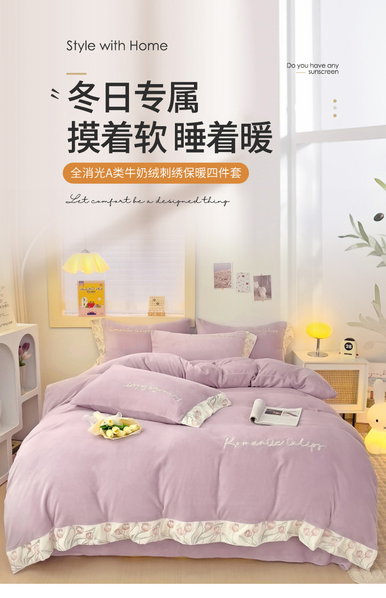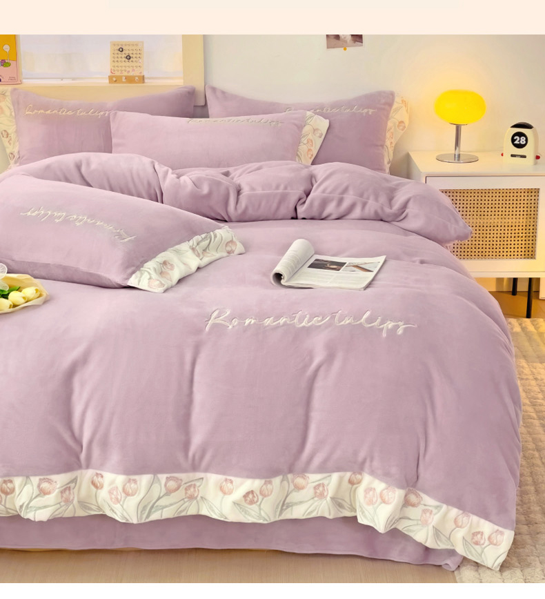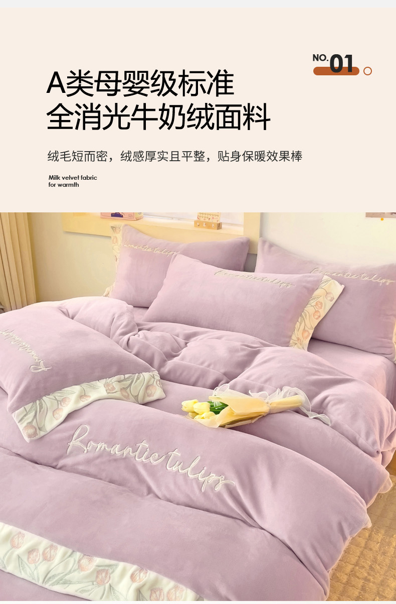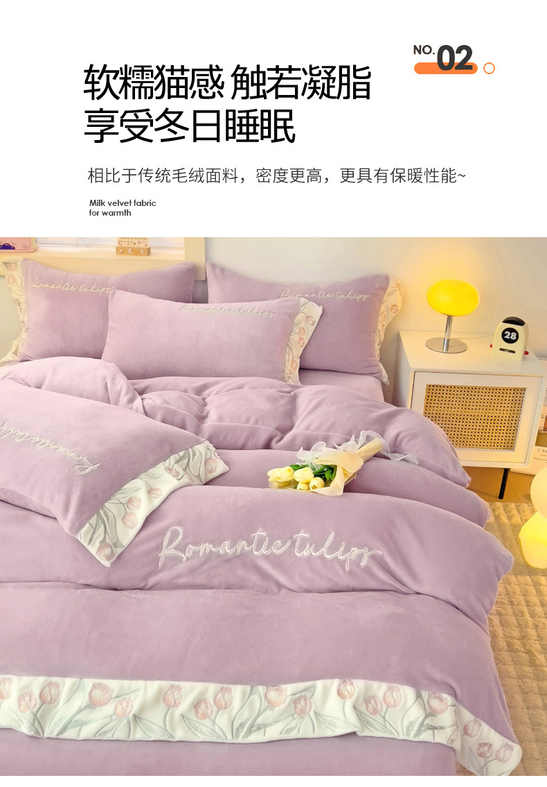 星尚家纺 2024新款全消光A类230g牛奶绒刺绣四件套-郁金香 蔷薇紫