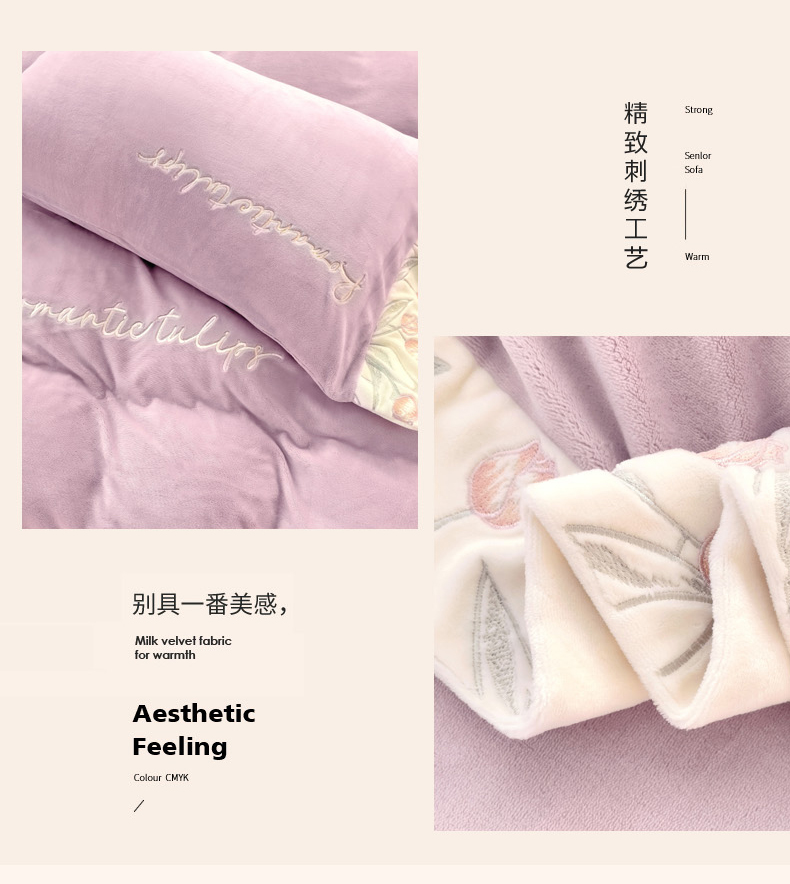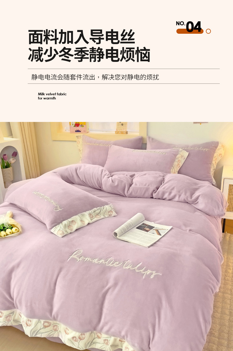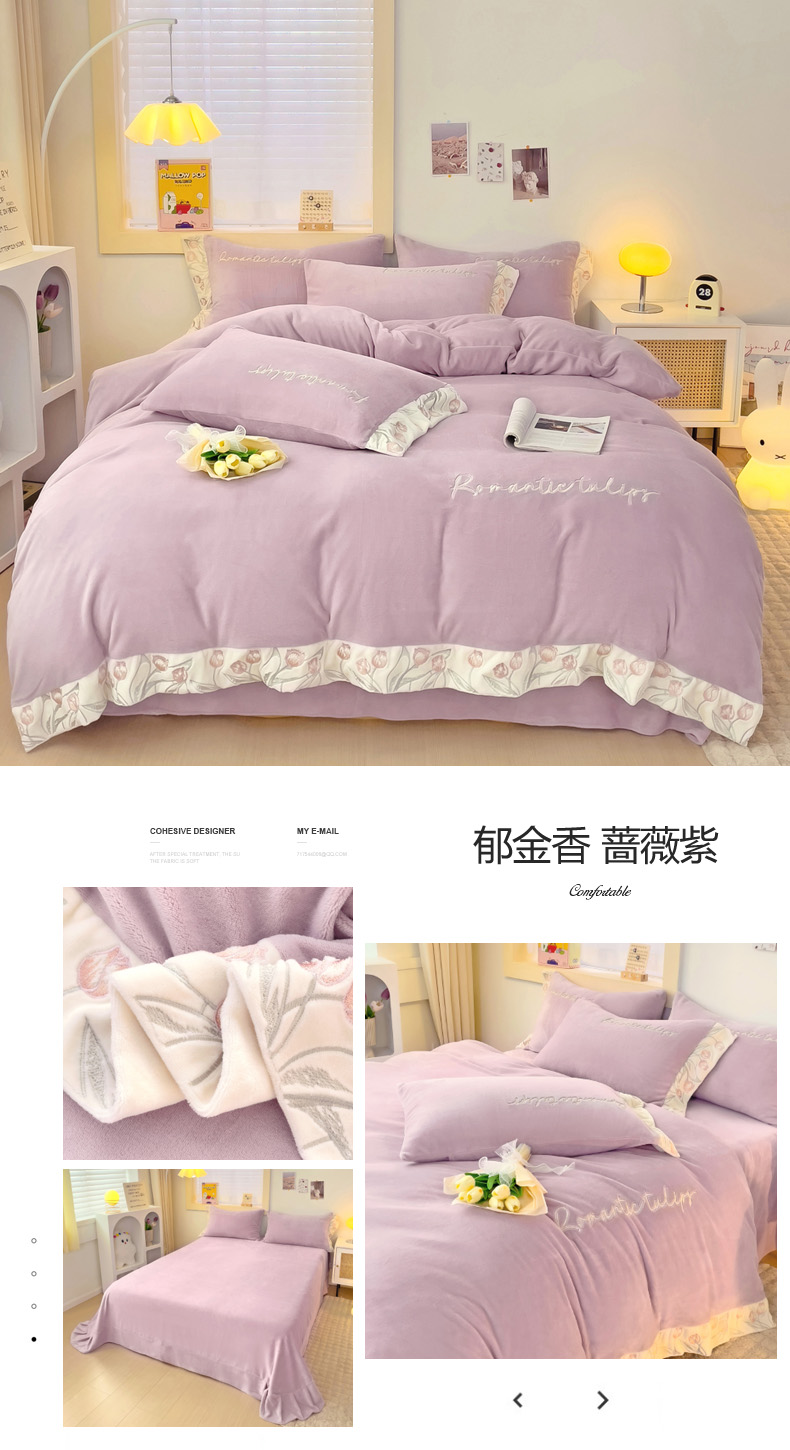 星尚家纺 2024新款全消光A类230g牛奶绒刺绣四件套-郁金香 蔷薇紫