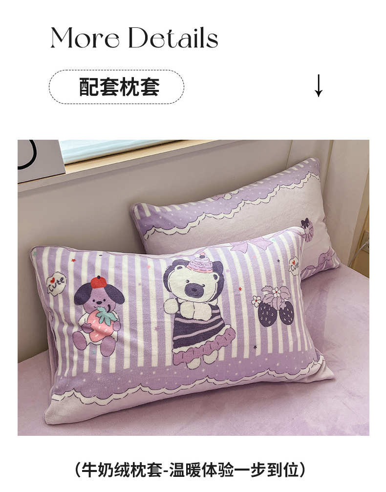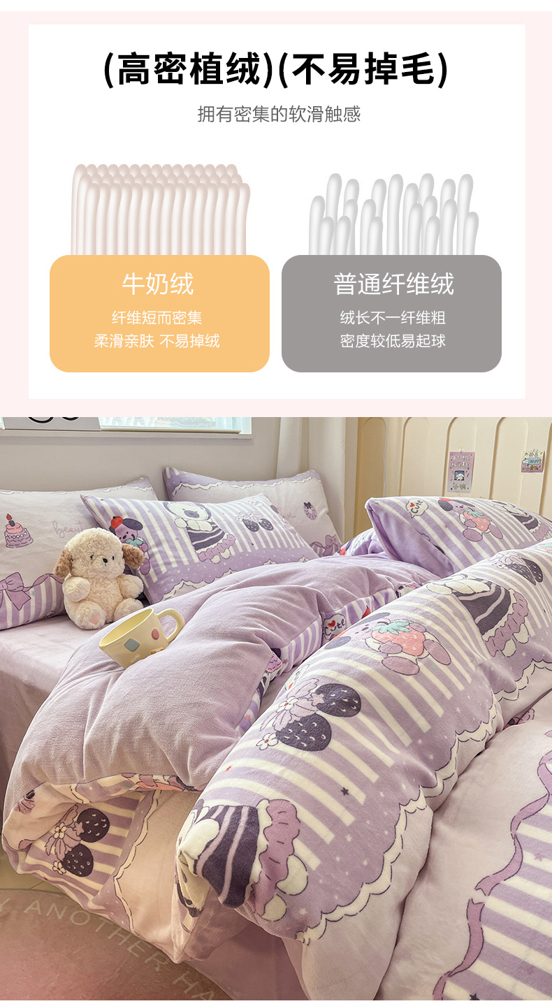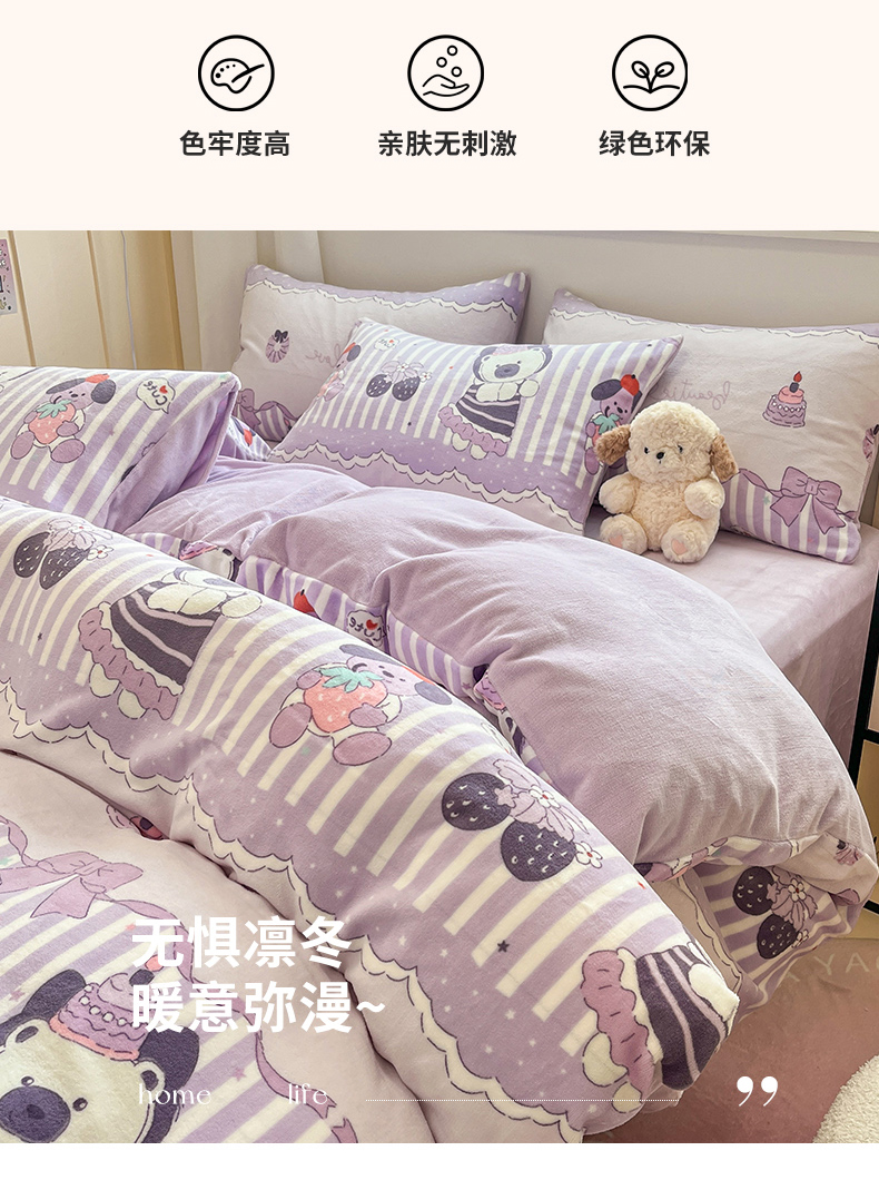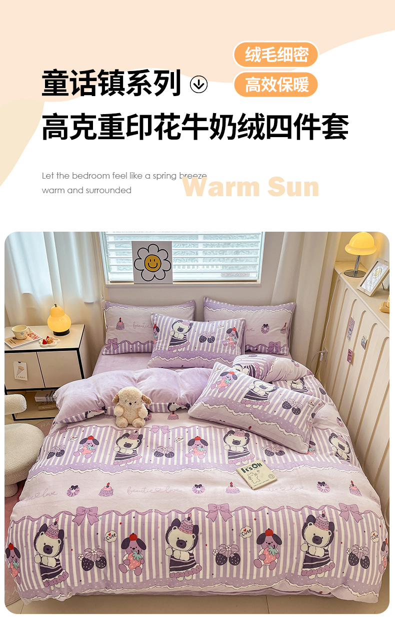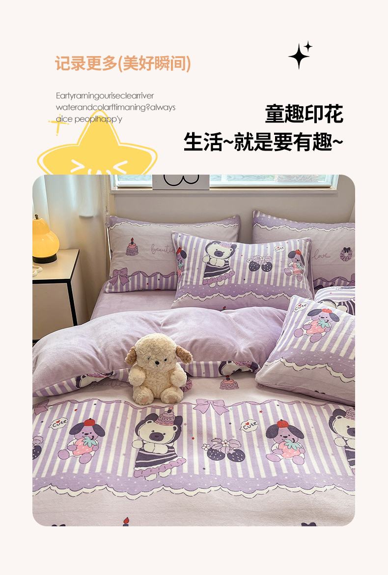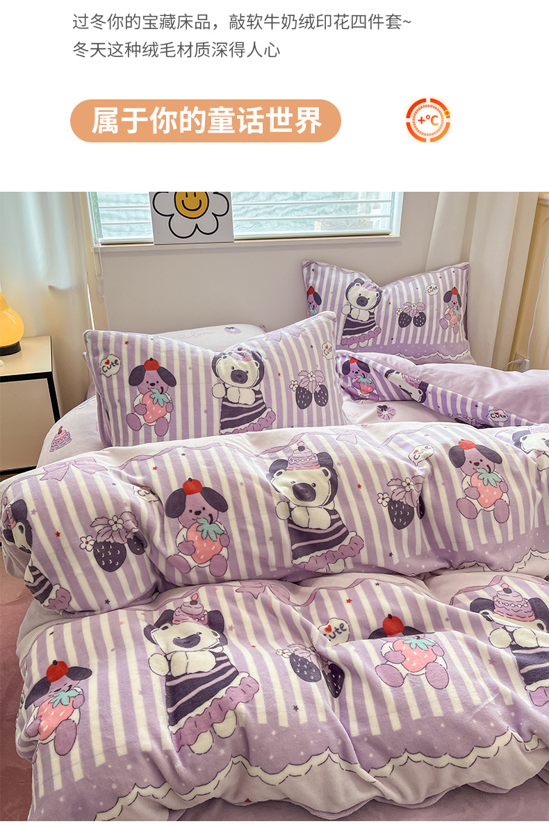 商品名称:捌月 2024新款童话镇系列高克重印花牛奶绒四件套卡通小清新加厚保暖绒套件 美乐妮