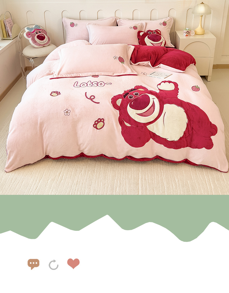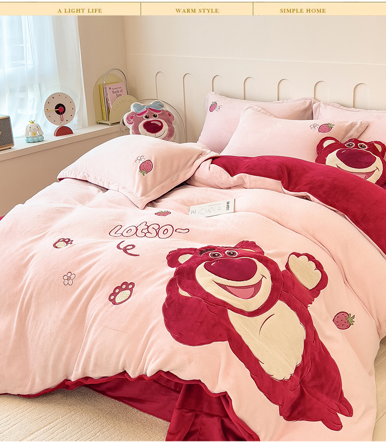 金绣美居 2025新款牛奶绒毛绒贴布绣花保暖四件套-开心熊 玛瑙红