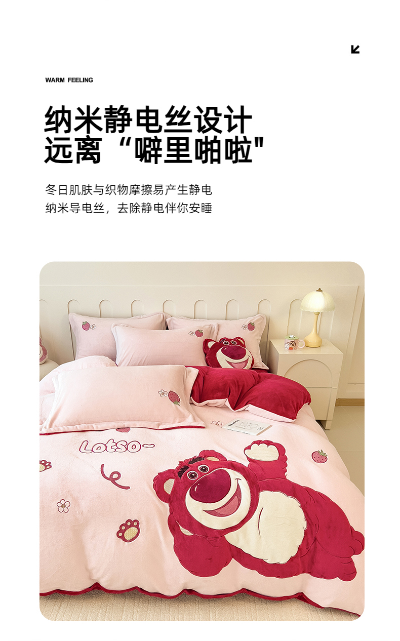 商品名称:金绣美居 2025新款牛奶绒毛绒贴布绣花保暖四件套-开心熊 玛瑙红