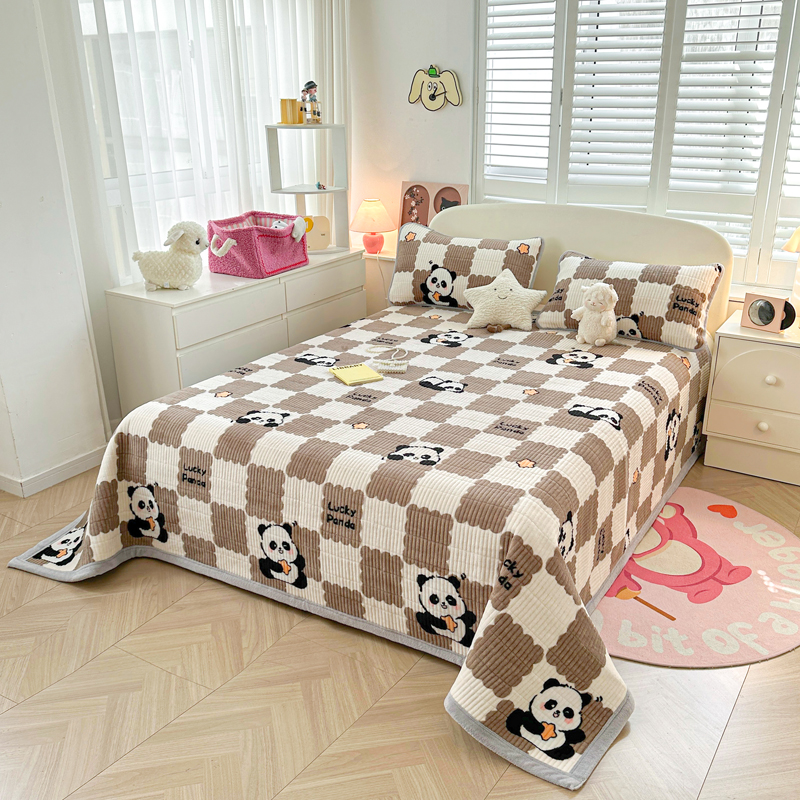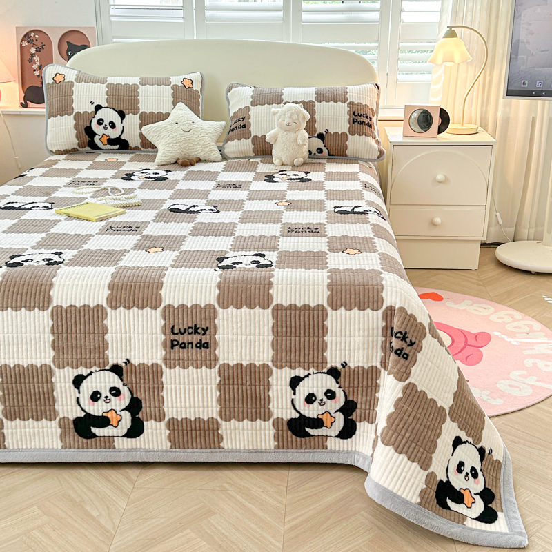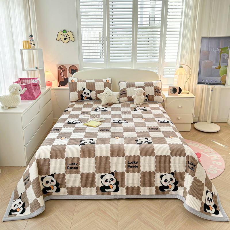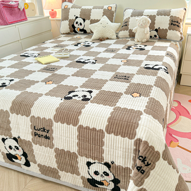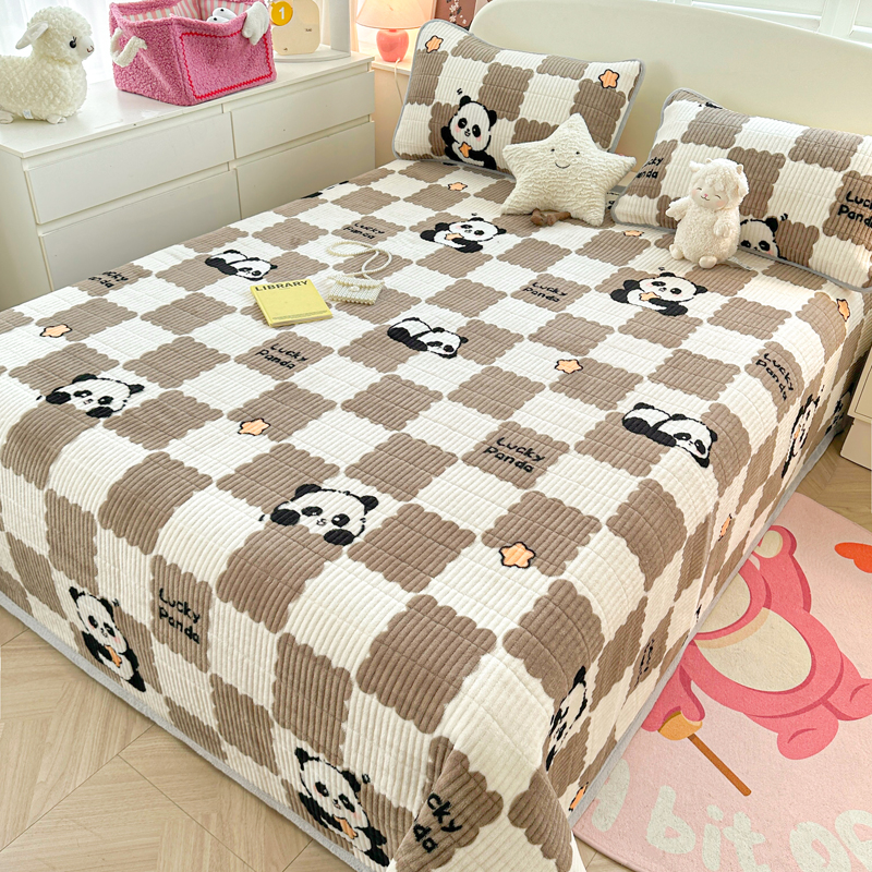 梵朴 2024新款牛奶绒直角包边床盖 棋盘格熊猫