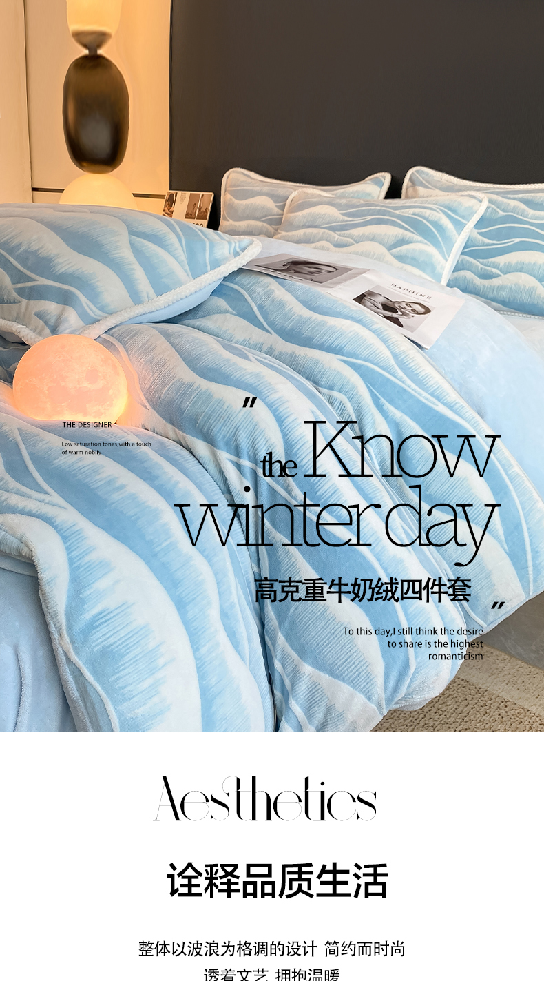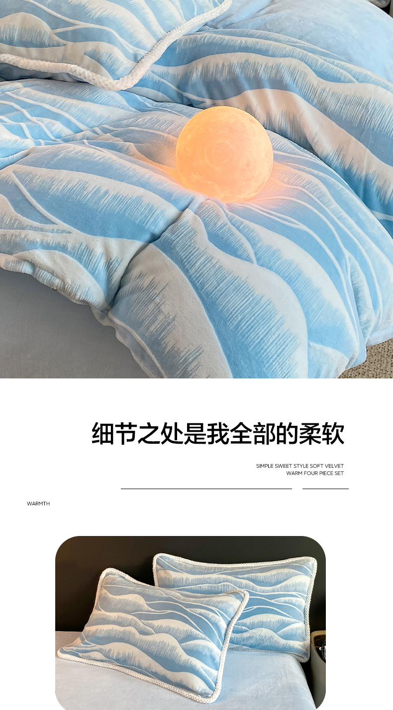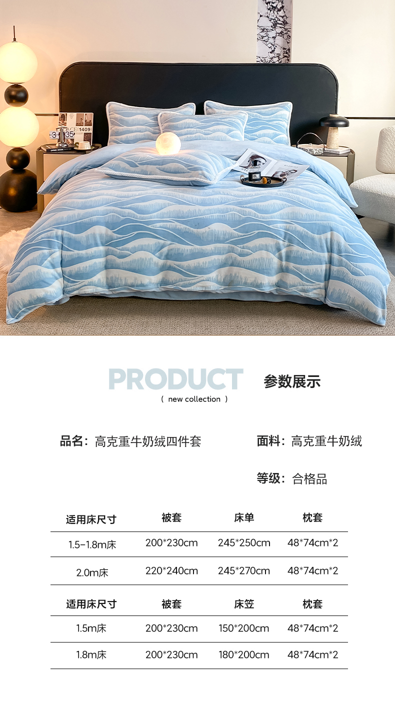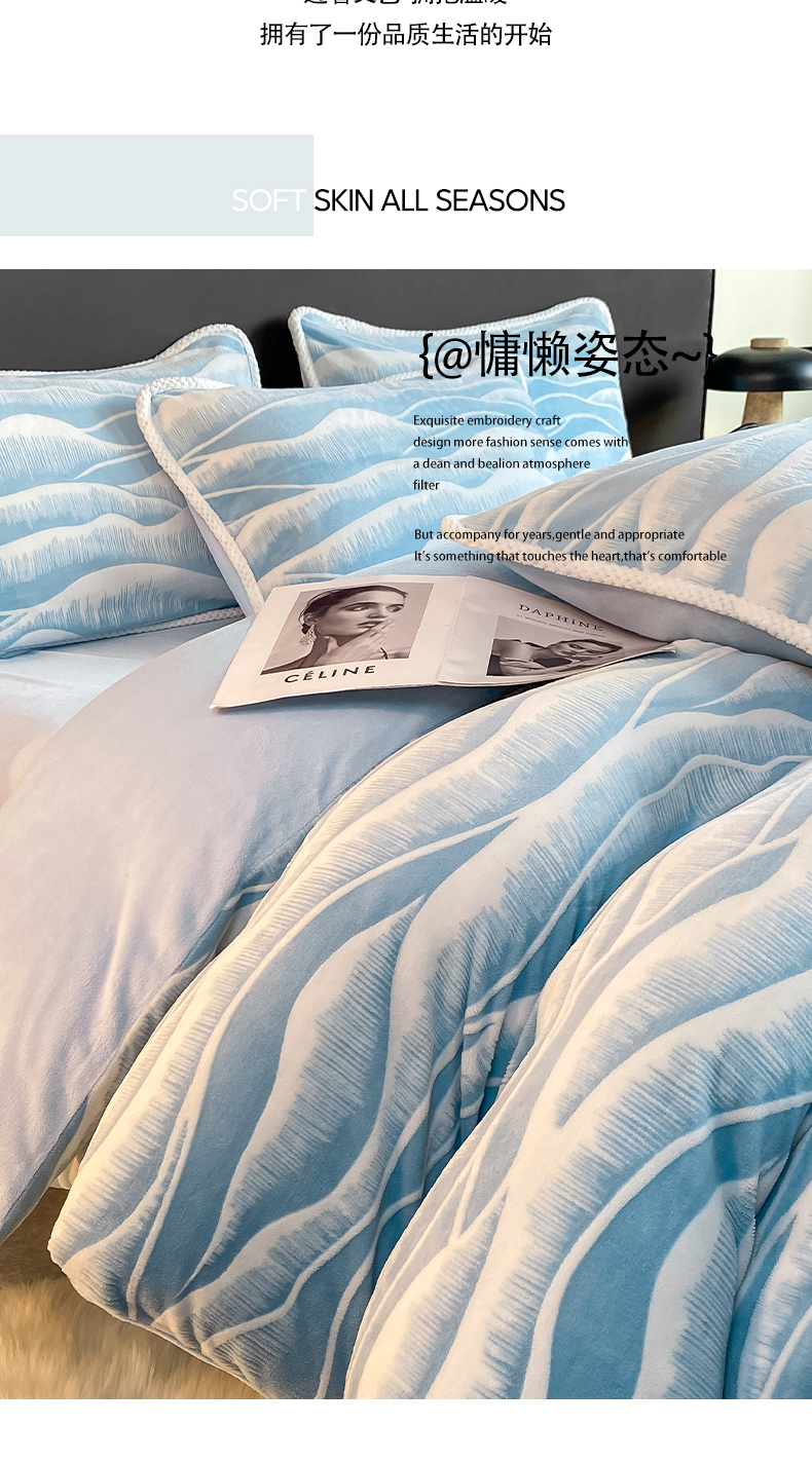 富之航家纺 2024新款牛奶绒剪花四件套 浪花-蓝