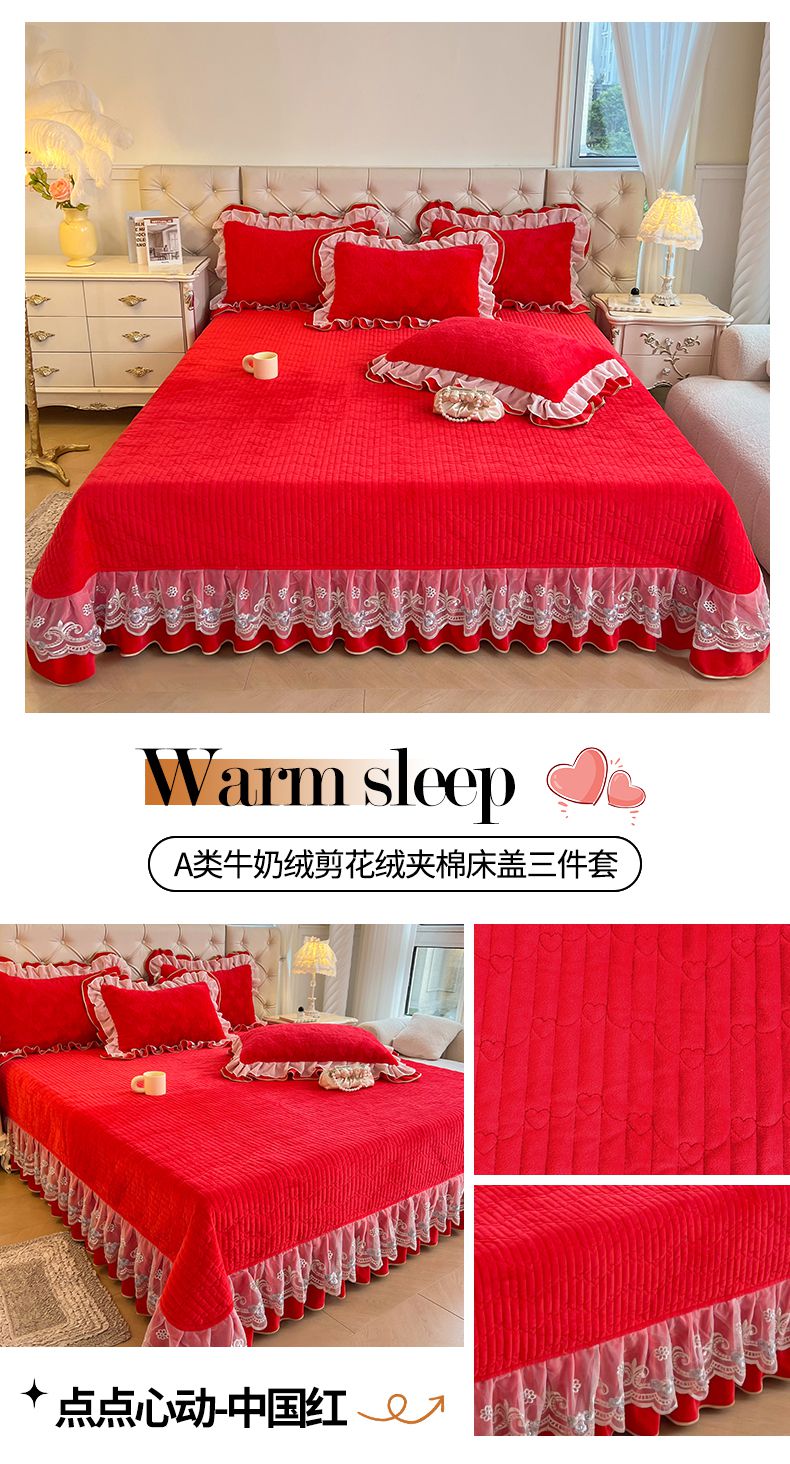 (总)宜凡家纺 2025新款婴儿绒压花全夹棉床盖四件套,韵雅-中国红,韵雅-黑天鹅