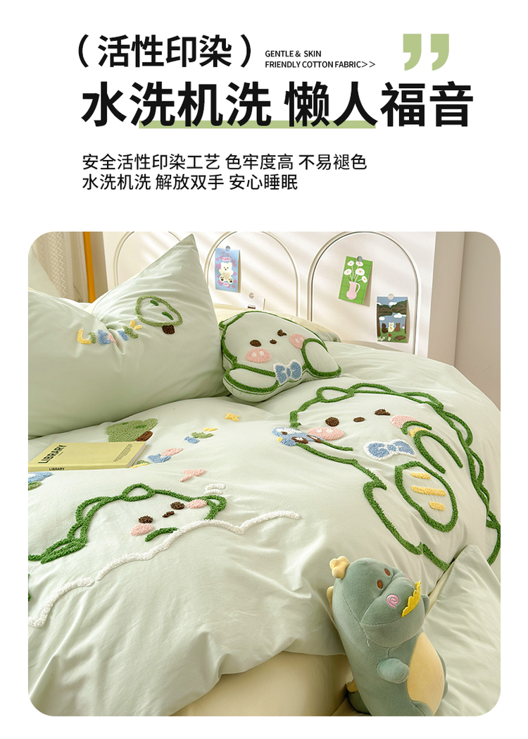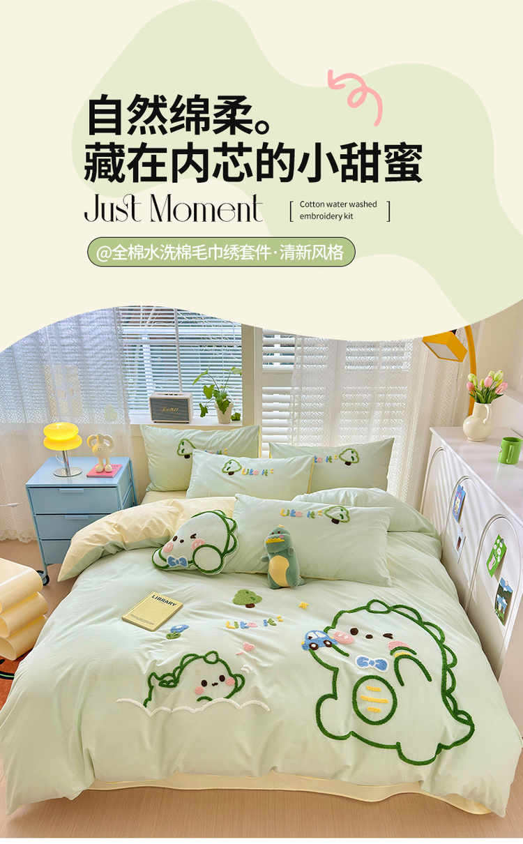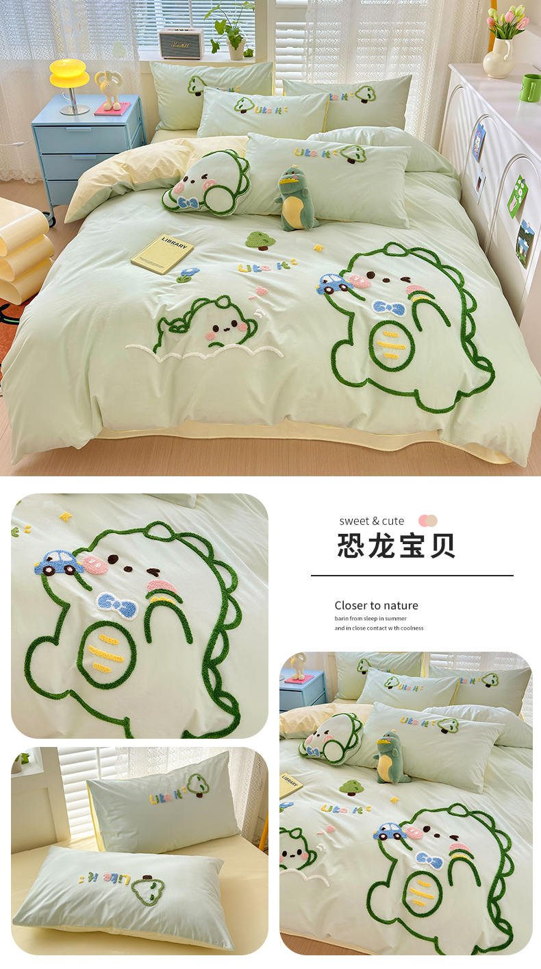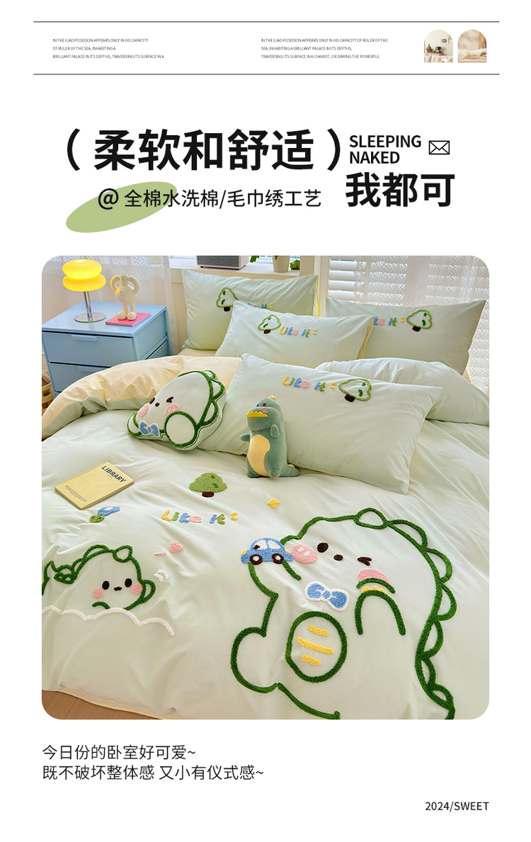 商品名称:买家秀热款花型不断货 母婴级A类ins风水洗棉四件套水洗棉毛巾绣四件套水洗棉床笠四件套提花绣花四件套 恐龙宝贝