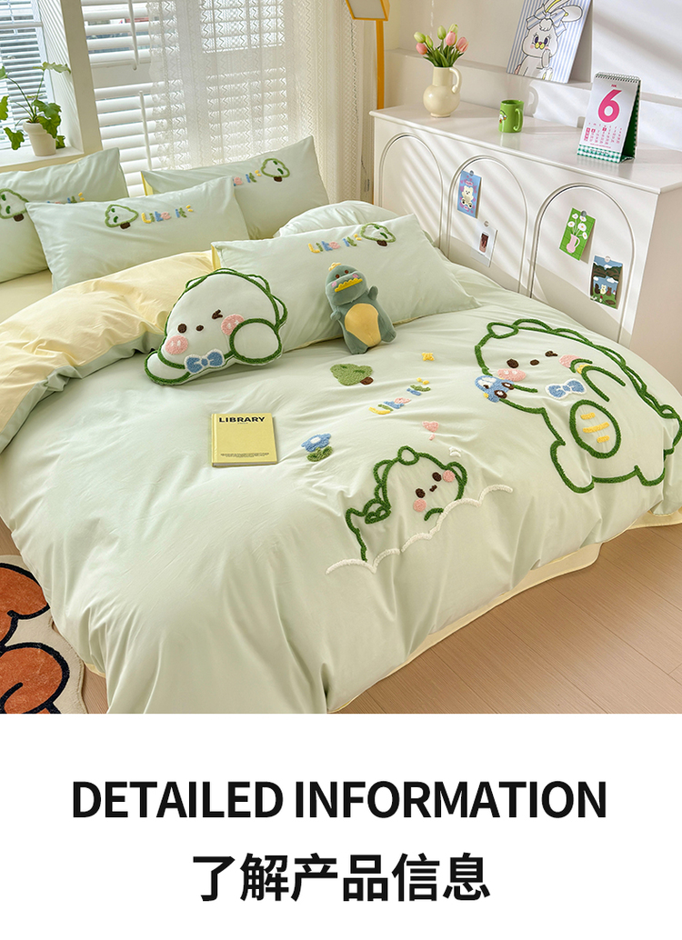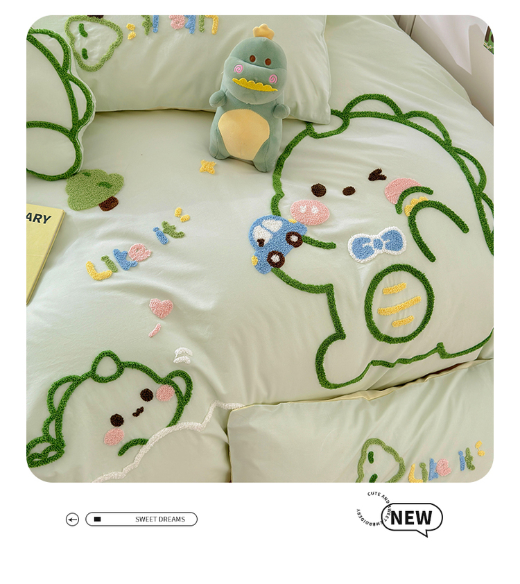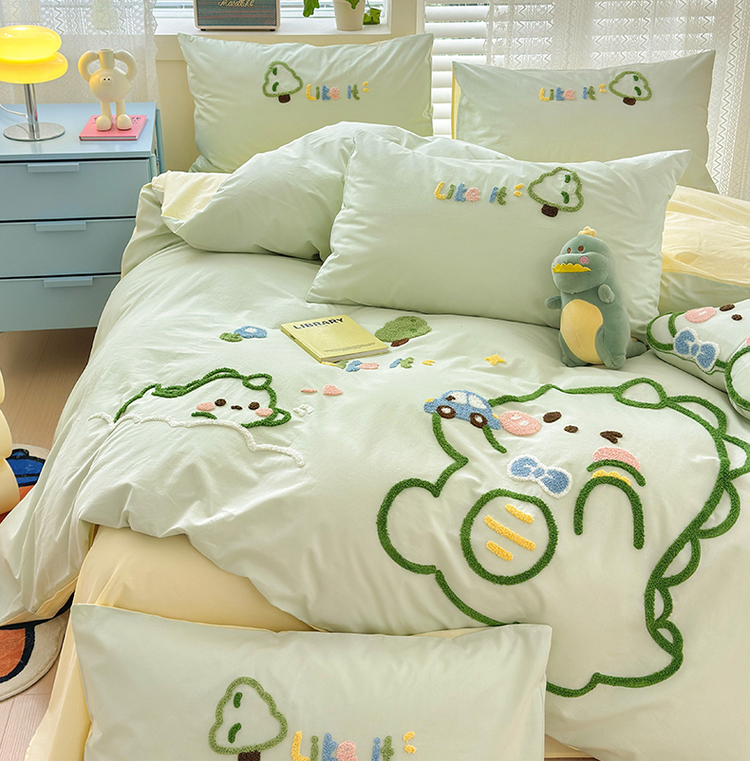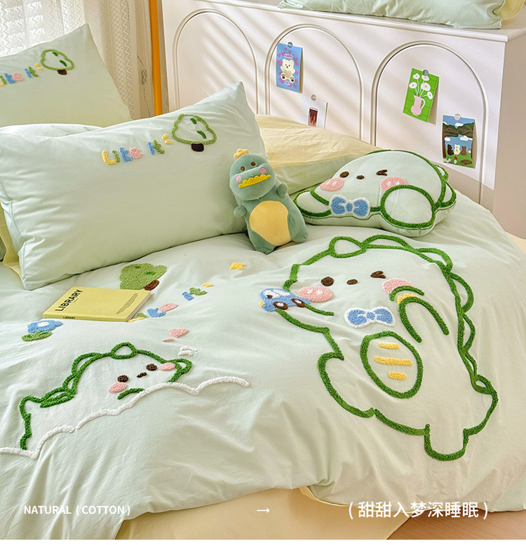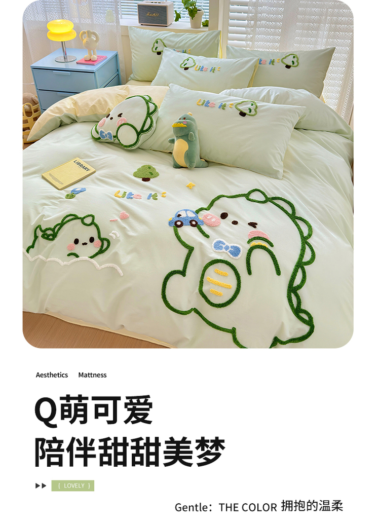 商品名称:买家秀热款花型不断货 母婴级A类ins风水洗棉四件套水洗棉毛巾绣四件套水洗棉床笠四件套提花绣花四件套 恐龙宝贝