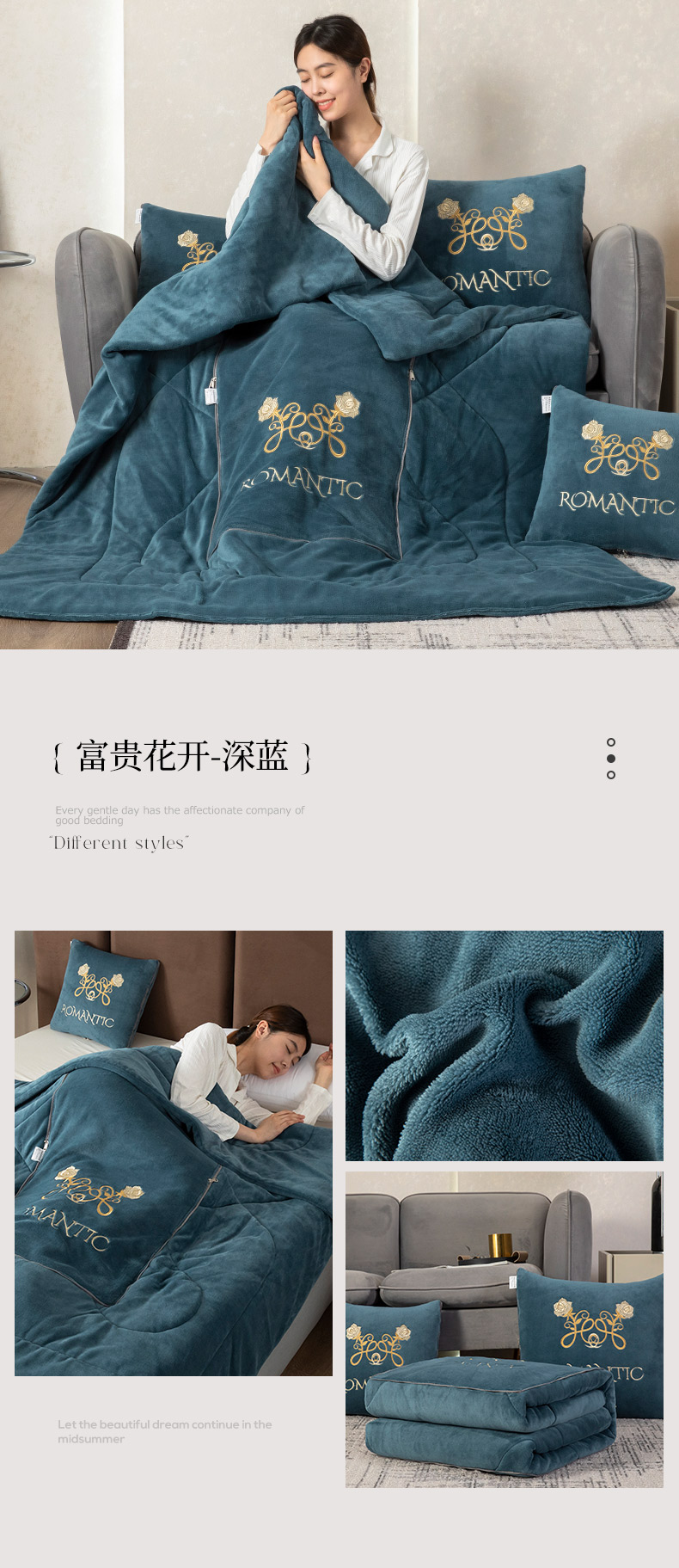 商品名称:雷人家纺 2023新款富贵花开牛奶绒刺绣多功能抱枕被 富贵花开-深蓝
