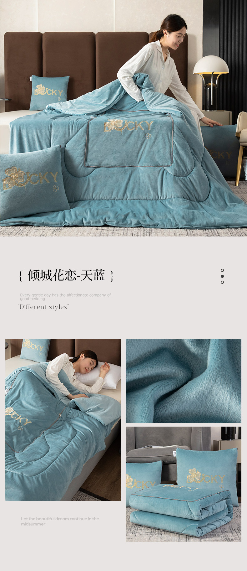 商品名称:雷人家纺 2023新款倾城花恋水晶绒刺绣多功能抱枕被 倾城花恋-天蓝