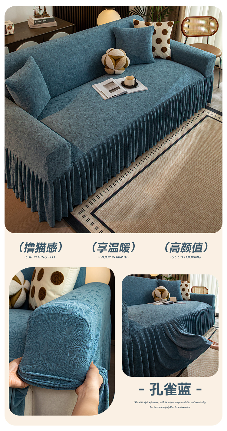 商品名称:沐沐家纺 2026新款小树叶裙边沙发套 孔雀蓝