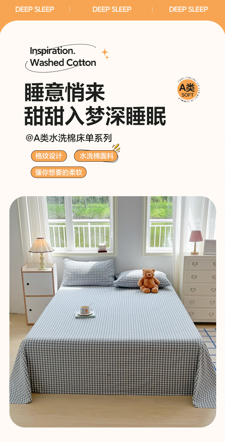 韩巢家纺 2025新款格子纯色A类水洗棉床单单件 A类兰色格-床单