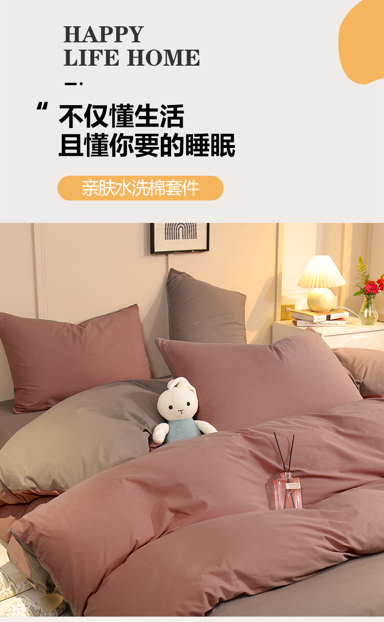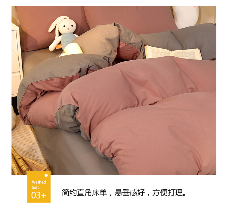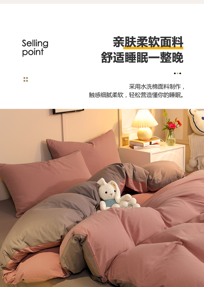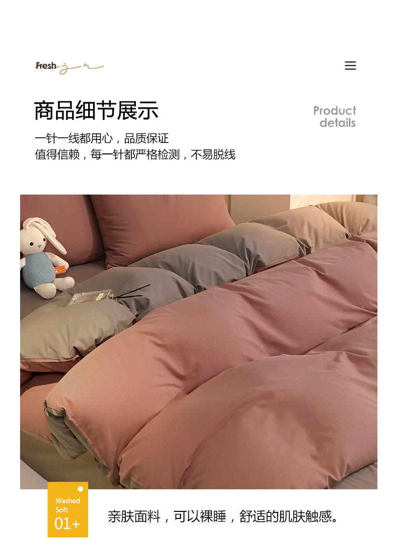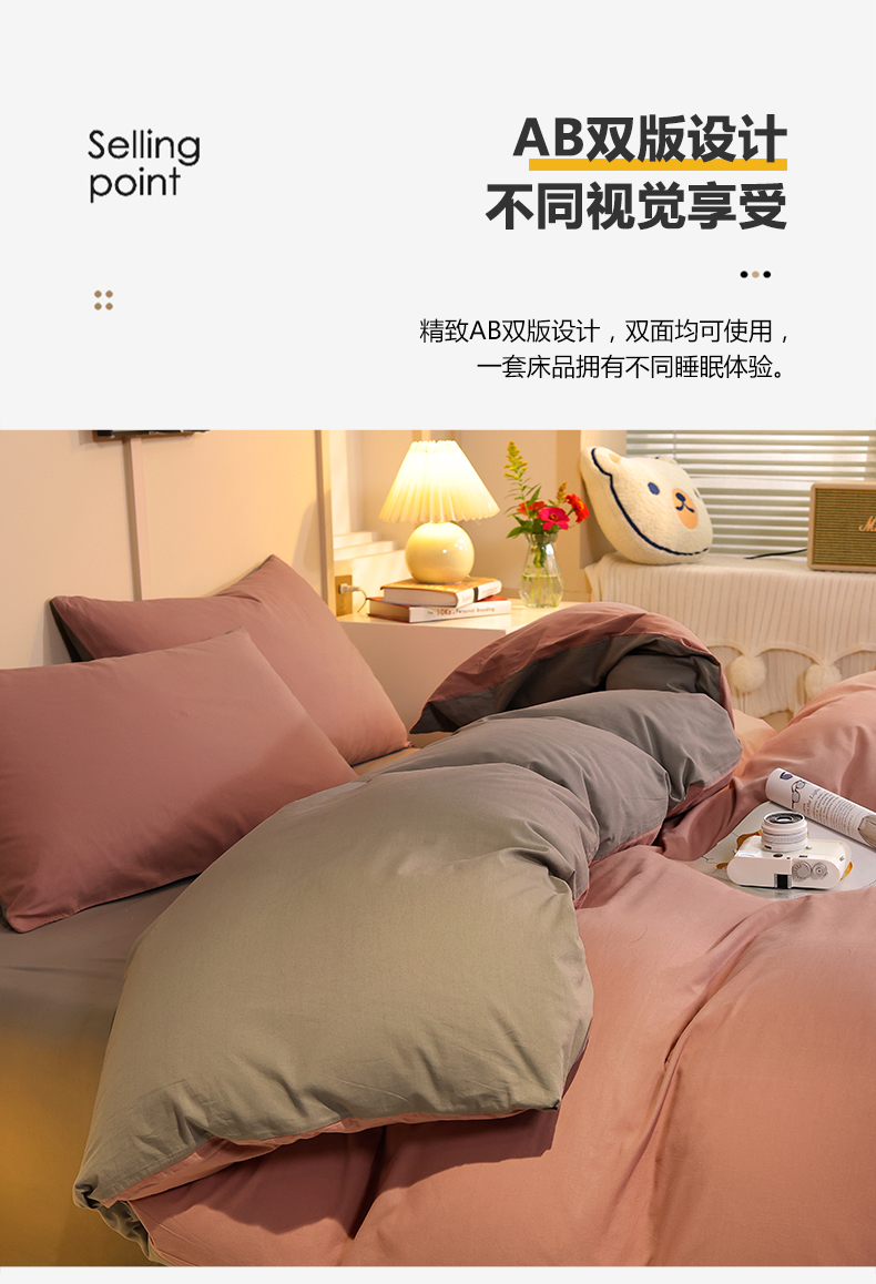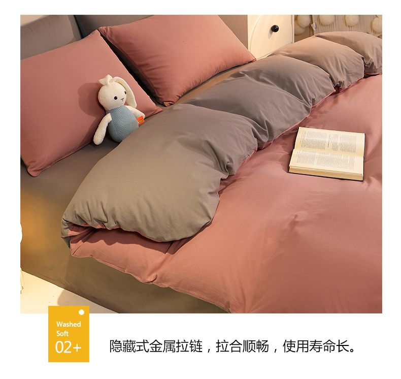 商品名称:悦织湾家纺 2025新款亲肤水洗棉纯色双拼四件套轻奢时尚 双拼豆沙+浅灰