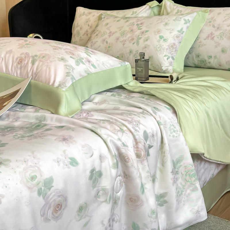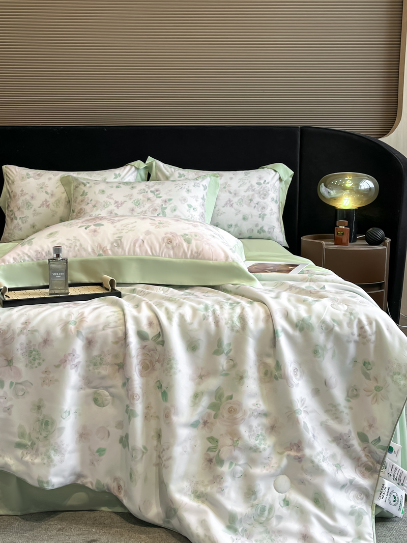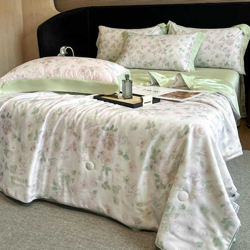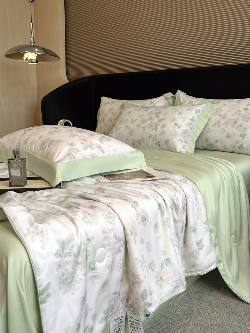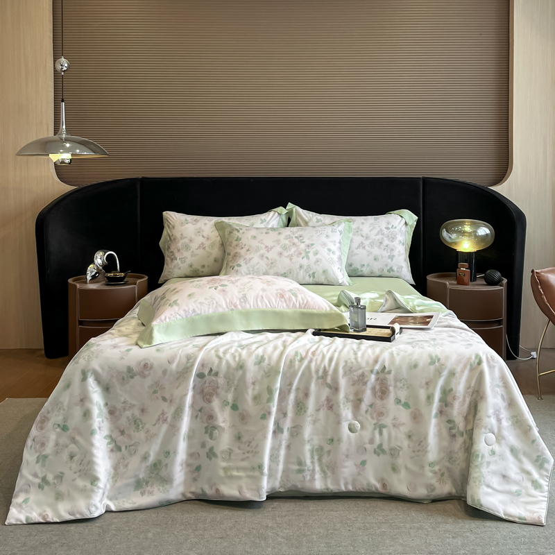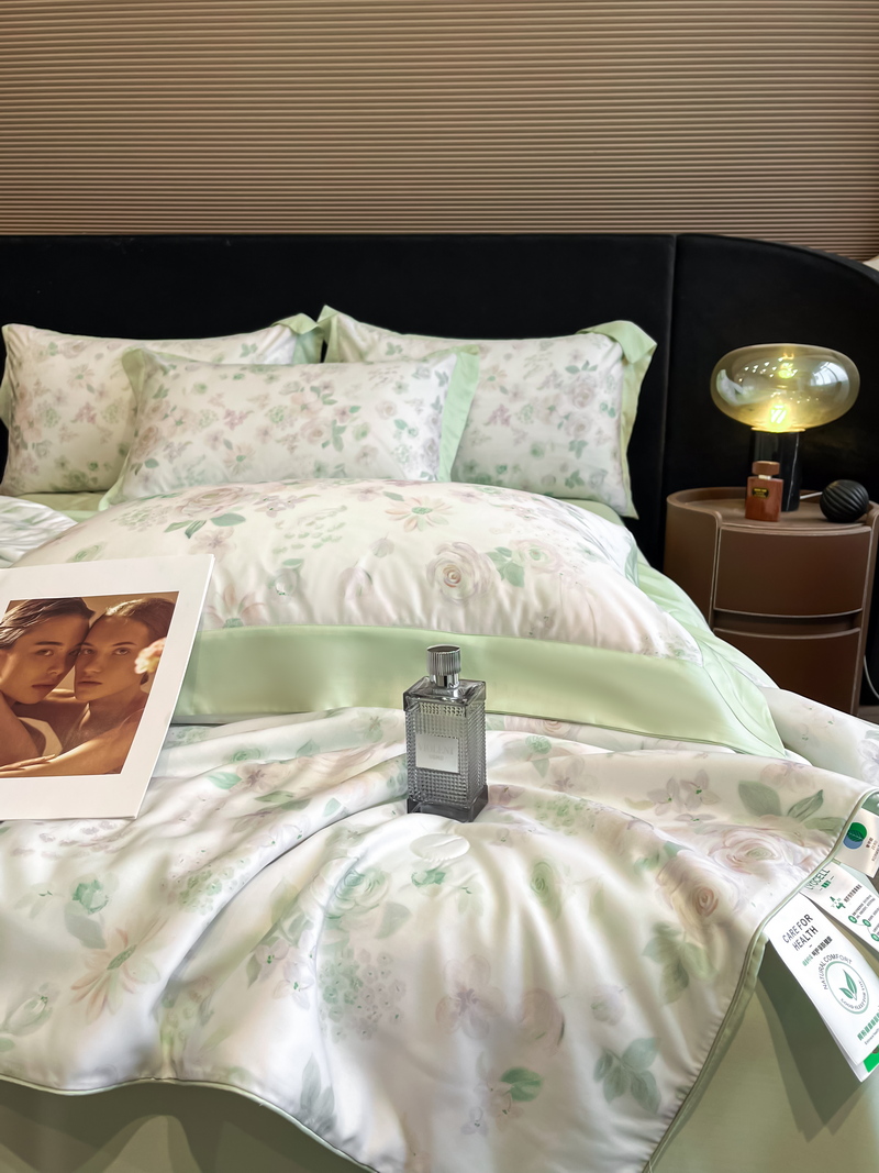 当前位置: 91家纺网 > 商品网购 > 床品套件 > 四件套 > 其它四件套 > 2025春夏新款简奢款嵌绳莱赛尔数码印花夏被四件套单夏被床笠床单款 念池-绿